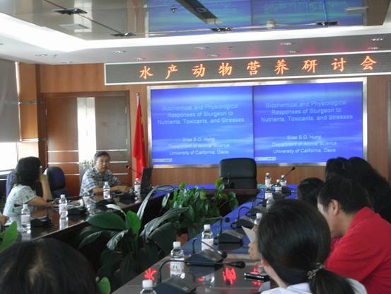 在研討會上,Silas S.O. HUNG教授為來自黃海所和中國海洋大學等單位的40多位研究人員和學生作了題為“Biochemical and Physiological Responses of Sturgeon to Various Nutrients, Toxicants, and Stresses”的報告,并與與會人員就所開展的研究工作進行了廣泛交流。