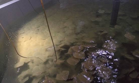 2014年6月-2015年5月,項目組與山東東方海洋科技股份有限公司萊州分公司合作,開展了以大菱鲆為代表的規模化循環水高端養殖模式技術研究。項目組在改進原有循環水工程系統、優化養殖技術的基礎上,開展了高、中、低三種密度的養殖對比實驗,獲得了大菱鲆在規模化生產條件下的生長率、成活率、餌料系數、經濟效益以及水質調控能力等多項技術參數,并與原生產車間的養殖進行了實時對比,取得了大菱鲆工廠化循環水三個不同養殖階段的實際生產數據,獲得了三個生產階段的適宜放養規格、養殖密度、養殖周期、分級策略以及循環系統的實時調整方案,初步建立起工廠化循環水高效養殖管理技術和規范化的運行模式。