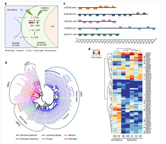 研究團隊獲得了海帶主要栽培品系的高質量基因組組裝結果,組裝大小為537 Mb,覆蓋了全基因組序列的98.5%,共有18,733個蛋白編碼基因。比較基因組學分析發現海帶基因組擴增主要源于基因家族的擴增,海帶與絲狀褐藻水云的祖先獲得1,240個基因家族,其中與細胞壁合成、鹵素代謝、發育與防御有關的基因家族出現明顯擴增。進一步的功能分析發現,褐藻膠合成關鍵酶甘露糖醛酸C-5差向異構酶及鹵素代謝關鍵酶鹵素過氧化物酶通過基因大量復制實現其功能分化。