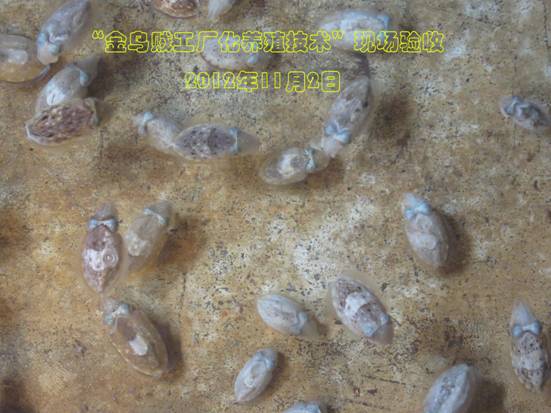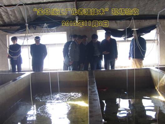 11月2日,青島市海洋與漁業局邀請有關專家,對由黃海水產研究所及青島金沙灘水產開發有限公司共同完成的國家科技支撐計劃(2011BAD13B08)中的 “金烏賊工廠化養殖技術”進行了現場驗收。驗收專家組由中國海洋大學、中科院海洋研究所、山東省海水養殖研究所、青島市黃島區水產技術推廣站等有關單位的專家組成。