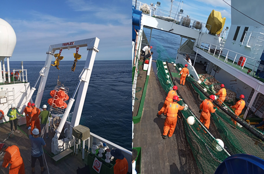 此次海試主要開展了漁業資源原位聲學觀測潛標的布放與回收、自主式科學探魚儀的水下運行,浮游生物多聯網的收放與采樣效果,以及漁業資源底層拖網的收放與取樣效果等內容的測試。海試的目的是對以上設備的海上操作進行演練,并確保采集數據的可靠性與樣本的有效性,達到了預期效果。