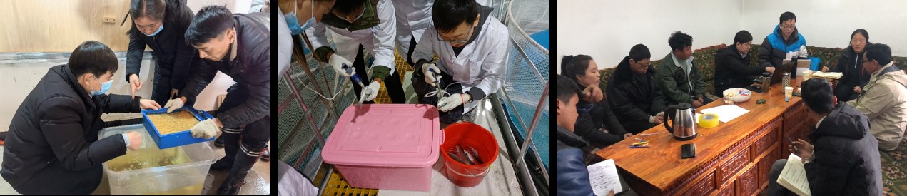 冬季是亞東鮭魚產卵和孵化的關鍵時期,而春季則是其流行疾病的高發(fā)時期。自雙方合作以來,黃海水產研究所科技幫扶團隊采用“線上+線下”結合的方式,密切跟蹤亞東鮭魚的養(yǎng)殖過程,值此冬末春初養(yǎng)殖關鍵階段及時派出專家團隊前往西藏,再次進行現(xiàn)場技術指導。在亞東縣農業(yè)農村局的密切配合下,黃海水產研究所李杰副研究員和劉長琳副研究員根據(jù)亞東鮭魚的養(yǎng)殖模式和養(yǎng)殖條件,指導亞東鮭魚養(yǎng)殖團隊建立了受精卵消毒、病害初步診斷、疾病防控等一系列實用化操作方法和技術,并對養(yǎng)殖管理和技術人員進行了現(xiàn)場操作培訓和技術指導。針對前期亞東鮭魚養(yǎng)殖和管理過程中遇到的技術難題,黃海水產研究所專家與當?shù)乜h農業(yè)農村局、養(yǎng)殖團隊進行了座談交流,在充分總結前期技術經驗的基礎上,對后期繁育、養(yǎng)成、投喂和病害防控等管理技術提出了指導建議。