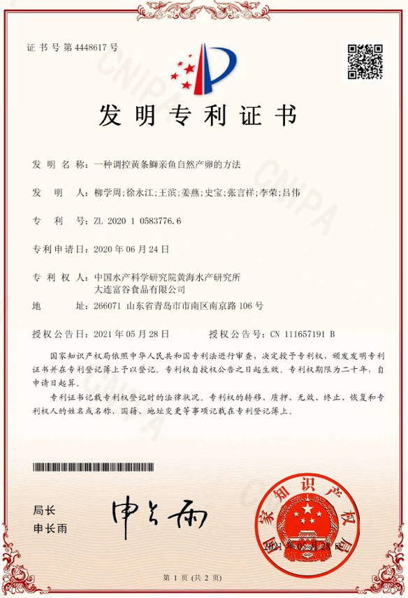 近日,由中國水產科學研究院黃海水產研究所柳學周等發明的“一種調控黃條鰤親魚自然產卵的方法”獲國家發明專利授權,專利號:ZL202010583776.6。
