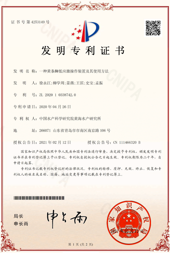 近日,由中國水產科學研究院黃海水產研究所徐永江等發明的“一種黃條鰤低應激操作裝置及其使用方法”獲國家發明專利授權,專利號:ZL202010338742.0。