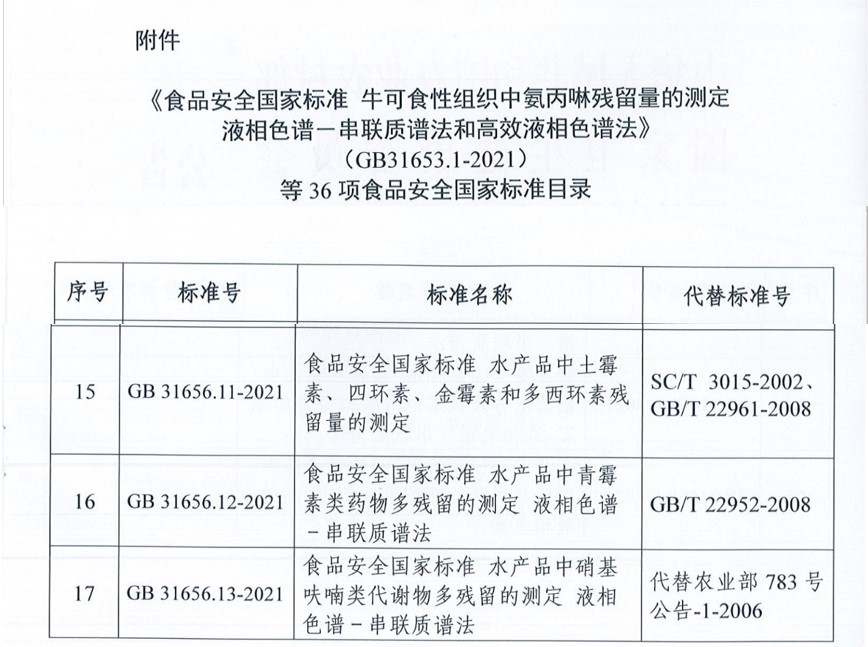 近日,農業農村部、國家衛生健康委員會和國家市場監督管理總局聯合發布36項食品安全國家標準(第488號)。由中國水產科學研究院黃海水產研究所李兆新研究員牽頭制修訂的3項水產品中藥物殘留檢測技術國家標準正式獲批發布。