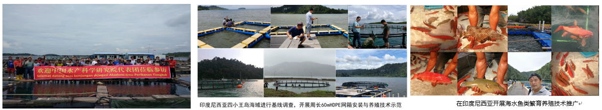 黃海水產研究所2014年起參與了科技部“中國東盟海上合作基金項目-海水養殖技術聯合研究與推廣中心”建設,該項目是第一批落實17個“中國-東盟海上聯合基金”項目之一。項目組以“互利共贏”為宗旨,與泰國、印度尼西亞、馬來西亞、菲律賓、越南等東盟國家開展海水養殖國際合作,共同建設“中國-東盟海水養殖技術聯合研究與推廣中心”,合作開展海水魚類等繁育養殖遺傳育種技術、大型海上網箱養殖技術、水產動物疾病防控、健康養殖等聯合研究和技術推廣,與東盟相關國家簽訂涉漁技術合作協議8份,組織實施交流培訓12批次。與泰國農業大學、亞洲理工學院、瑪希隆大學、布拉帕大學、印度尼西亞巴淡海洋研究所、三林萬業企業集團、哈利姆公司、菲律賓Red-Seidon水產養殖公司、馬來西亞GST海產集團、越南昇龍生物科技有限公司等開展了聯合研究和水產養殖技術推廣培訓,建立養殖示范基地。如,在印度尼西亞和菲律賓開展豹紋鰓棘鱸、虎龍石斑魚等繁育與網箱養殖技術示范推廣和波紋唇魚繁育保護工作;在馬來西亞開展以紅鰭笛鯛和金目鱸等繁育選育與健康養殖技術示范與推廣;針對泰國、柬埔寨、越南和菲律賓等舉辦了多次水產疫病診斷技術培訓,提供對蝦及魚類病原快速檢測試劑盒;與泰國布拉帕大學在海水珊瑚礁魚類等種質保存、繁育制種及品質改良等研究領域開展聯合研究等。