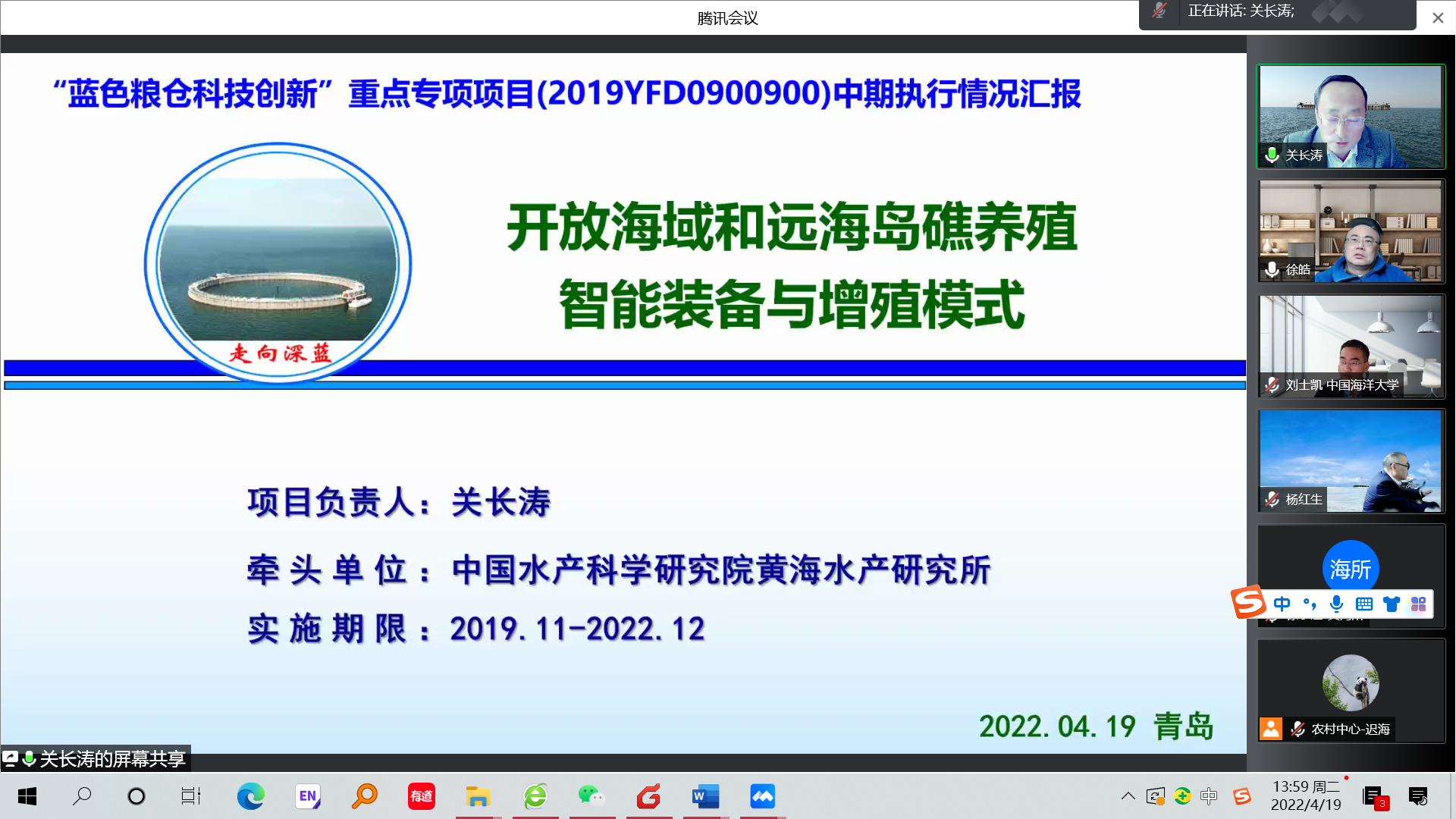 4月19日,科技部中國農(nóng)村技術(shù)開發(fā)中心組織專家,以視頻會議形式對中國水產(chǎn)科學(xué)研究院黃海水產(chǎn)研究所主持的國家重點研發(fā)計劃“藍色糧倉科技創(chuàng)新”重點專項“開放海域和遠海島礁養(yǎng)殖智能裝備與增殖模式”(2019YFD0900900)項目進行了中期檢查。農(nóng)村中心專項管理團隊、項目中期檢查專家組、項目牽頭單位相關(guān)領(lǐng)導(dǎo),黃海水產(chǎn)研究所、大連理工大學(xué)、東海水產(chǎn)研究所、南海水產(chǎn)研究所、海南省海洋與漁業(yè)科學(xué)院、浙江海洋大學(xué)、漁業(yè)機械儀器研究所、萊州明波水產(chǎn)有限公司、煙臺中集藍海洋科技有限公司、三沙美濟漁業(yè)發(fā)展有限公司等10家項目參與單位共50余人參加了本次會議。