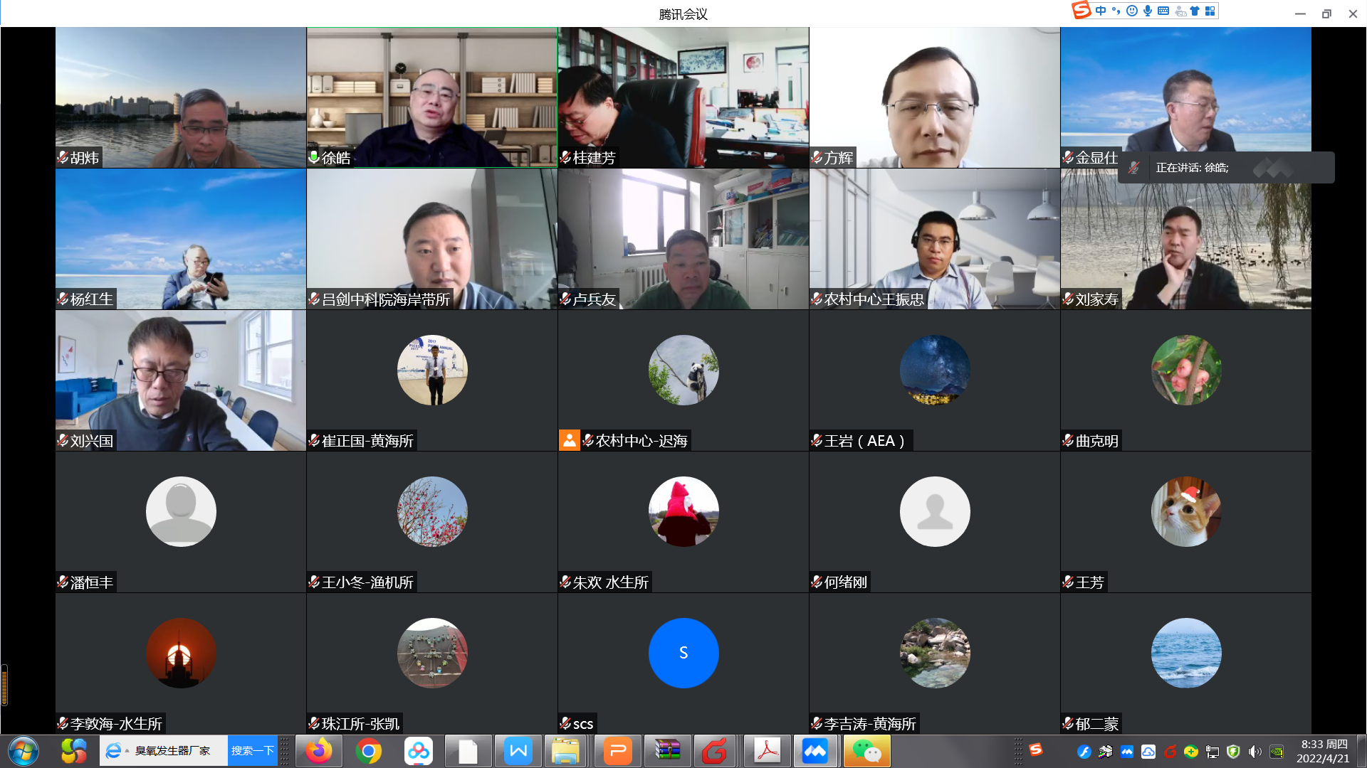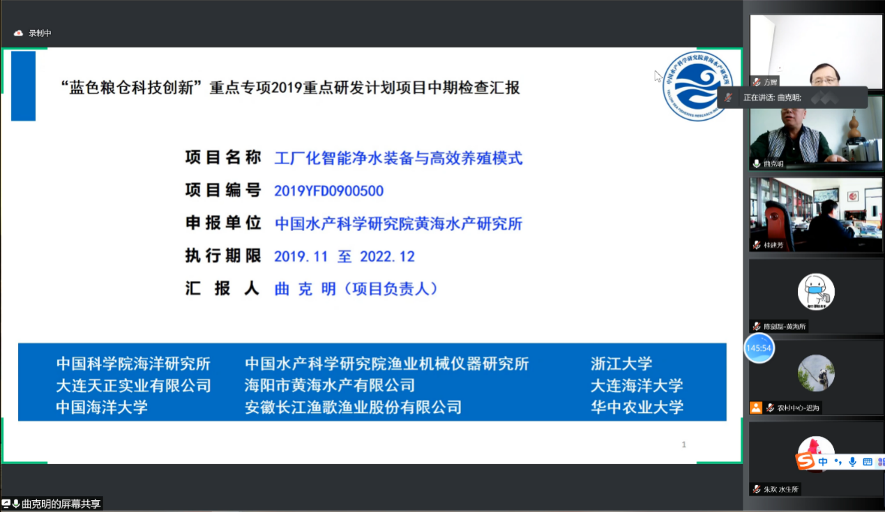 4月21日,由中國水產科學研究院黃海水產研究所牽頭承擔的國家重點研發計劃“藍色糧倉科技創新”重點專項“工廠化智能凈水裝備與高效養殖模式”(2019YFD0900500)項目中期檢查會以網絡視頻會議形式召開。會議由科學技術部中國農村技術開發中心主辦。農村中心科技攻關處處長盧兵友,“藍色糧倉科技創新”專項專員王振忠,項目中期檢查專家組專家桂建芳院士、楊紅生研究員、方輝研究員、陳煥根研究員、呂劍研究員,黃海水產研究所所長金顯仕、科研處處長劉志鴻,以及項目負責人、課題負責人、項目組成員等120余人參加了本次會議。