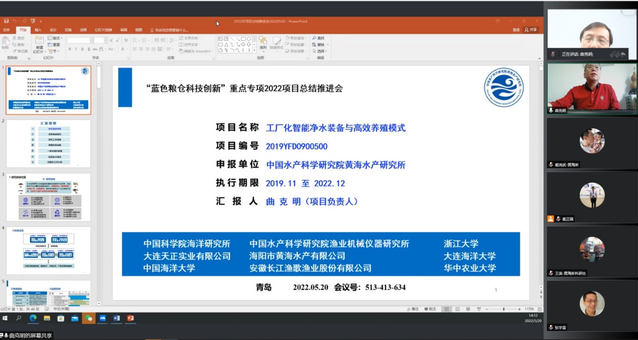 5月20日,由中國水產科學研究院黃海水產研究所牽頭承擔的國家重點研發計劃“藍色糧倉科技創新”重點專項“工廠化智能凈水裝備與高效養殖模式”(2019YFD0900500)2022年項目總結推進會以網絡視頻會議形式召開。項目咨詢專家組由中國水產科學研究院東海水產研究所所長方輝研究員、中國水產科學研究院漁業機械儀器研究所所長徐皓研究員、中國科學院煙臺海岸帶研究所呂劍研究員、浙江大學劉鷹教授和中國海洋大學宋協法教授組成,科技部中國農村技術開發中心專項管理團隊項目專員王振忠、遲海與會指導。黃海水產研究所副所長葉乃好、科研處副處長王濱,以及項目負責人、課題負責人、項目組成員等30余人參加了本次會議。