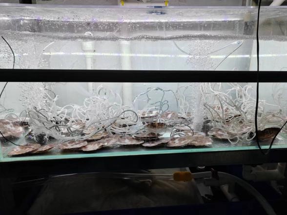 專家組進行了現(xiàn)場核查和取樣測量,查看了原始記錄,聽取了課題組的匯報,經(jīng)質(zhì)詢討論,形成驗收意見如下:該項研究探明了調(diào)控木下紫菜絲狀體生長發(fā)育及殼孢子放散的關鍵參數(shù),攻克了木下紫菜苗種繁育技術;采用該技術,培養(yǎng)3~4周貝殼絲狀體孢子囊枝形成率達50%以上,孢子囊枝雙分細胞形成比例達60%以上;誘導3~5天殼孢子放散達到高峰,殼孢子日放散量達40萬/殼,貝殼絲狀體培育達到同步成熟、集中放散效果;殼孢子苗附著牢固、形狀完整、色澤健康。每平米貝殼絲狀體可采苗2畝以上。