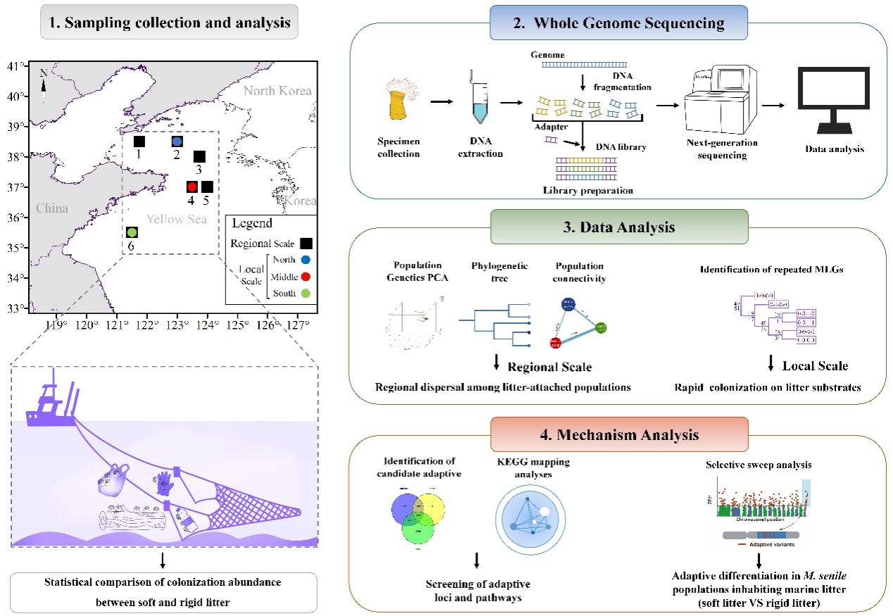 近日,中國水產科學研究院黃海水產研究所漁業資源生態學團隊在生態環境科學領域期刊Environmental Pollution在線發表了題為“Marine litter drives population expansion of Metridium senile (Cnidaria: Actiniaria):Genomic insights into dual-scale ecological drivers”的研究論文。該研究通過基因組學與生態學相結合的方法,揭示了海洋垃圾如何介導附著無脊椎動物的種群動態,填補了海洋環境中載體與生物互作過程的關鍵認知空白。尤為重要的是,本研究利用基因組學方法克服了傳統觀測手段的局限,首次從機制層面解析了海洋大型垃圾在區域與局部雙重生態尺度上的“載體效應”。