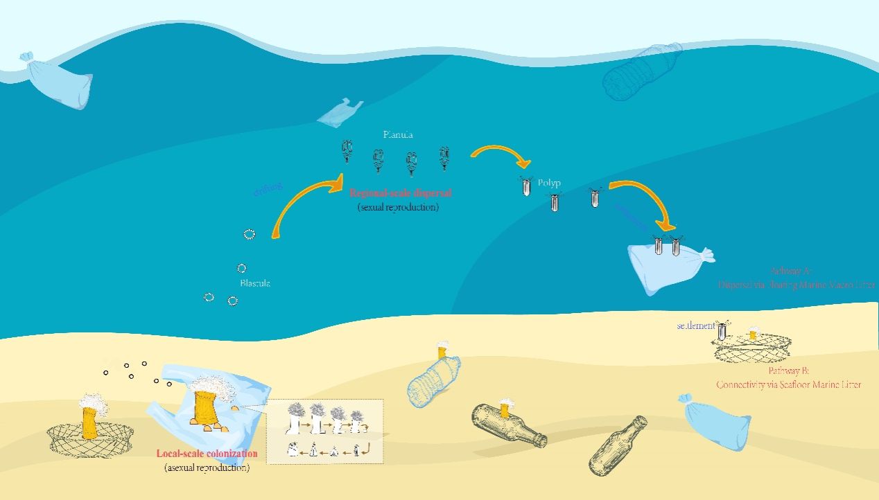 本研究創新性地通過全基因組重測序與多位點基因型識別分析等方法,發現海洋垃圾表面附著須毛高齡細指海葵Metridium senile群體間極低的遺傳分化程度與顯著基因流,表明垃圾在區域尺度上對幼蟲的輸運作用。在局部尺度上,克隆優勢(特定點位最高達42.86%)以及與無性繁殖和基質附著相關的適應性基因位點,共同促進了該物種在異質微生境中的快速定殖。這種基因組—宏觀生態學整合分析,首次揭示了一種“區域擴散?局地適應”耦合機制,探討了人為引入基質在重塑生物種群動態和生物多樣性格局中的作用。