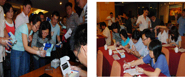 在全國水產(chǎn)技術(shù)推廣總站主辦的省級(jí)水生動(dòng)物檢疫理論知識(shí)培訓(xùn)班上對(duì)各省市水生動(dòng)物檢疫實(shí)驗(yàn)室的技術(shù)人員進(jìn)行檢測試劑盒的使用方法培訓(xùn)