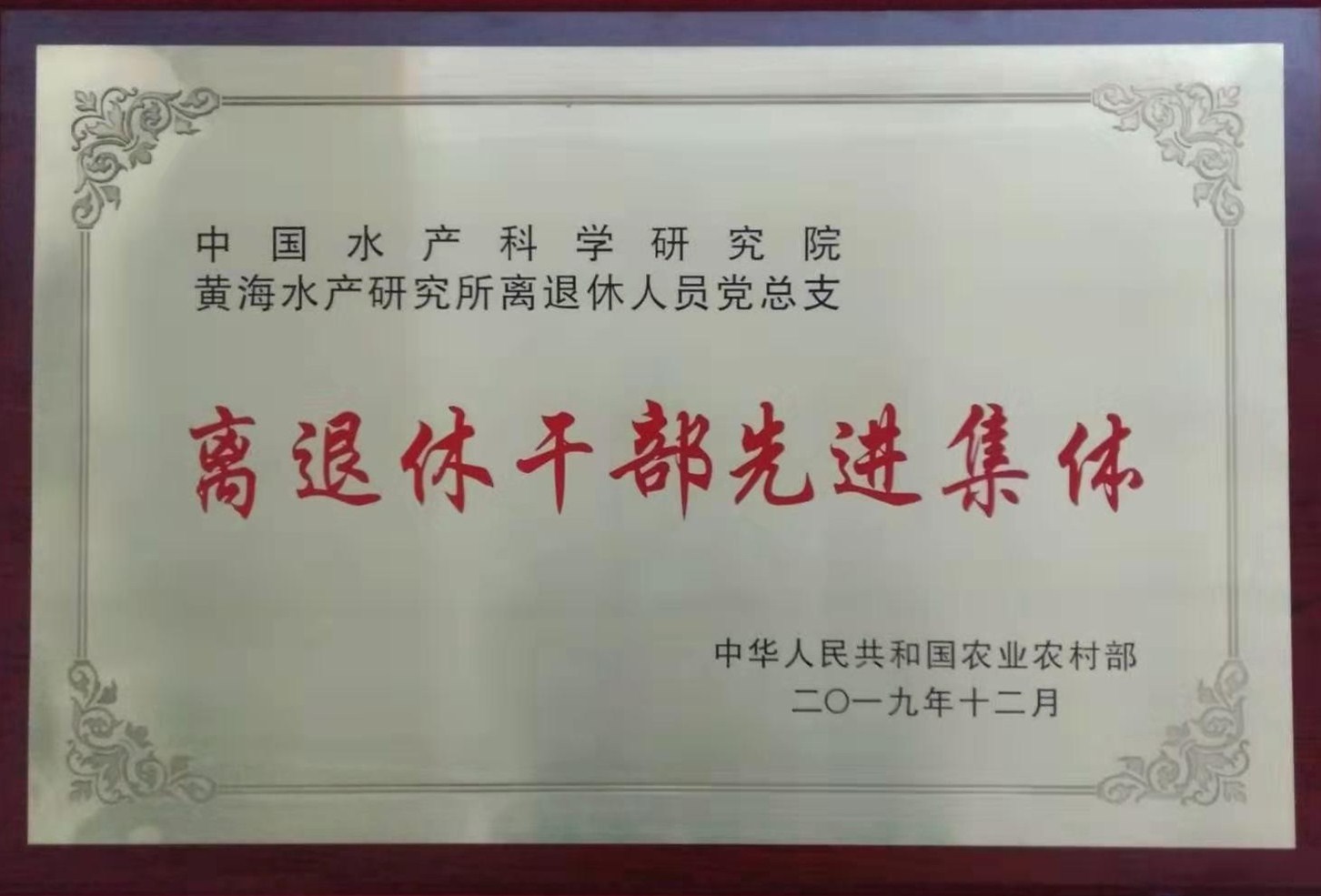 12月27日,農業農村部離退休干部“雙先”表彰暨向老同志通報情況會在北京召開,中共中國水產科學研究院黃海水產研究所離退休人員黨總支榮獲農業農村部離退休干部先進集體榮譽稱號。