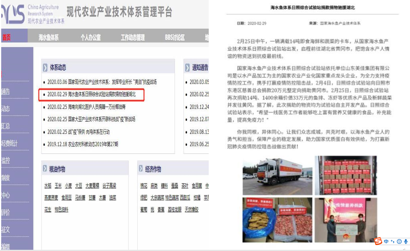 疫情無情,人間有愛。為支持抗疫一線,海水魚體系首席辦公室積極引導有條件的養殖企業開展援助湖北行動,日照、陵水、漳州等企業型綜合試驗站積極響應,累計向湖北地區捐款20萬元并捐贈價值近百萬元的即食魚排、冰凍卵形鯧鲹、鱸魚松、凍蝦等水產品,為抗疫一線的醫務工作者提供營養健康的優質高蛋白產品,為打贏疫情防控阻擊戰做出積極貢獻。