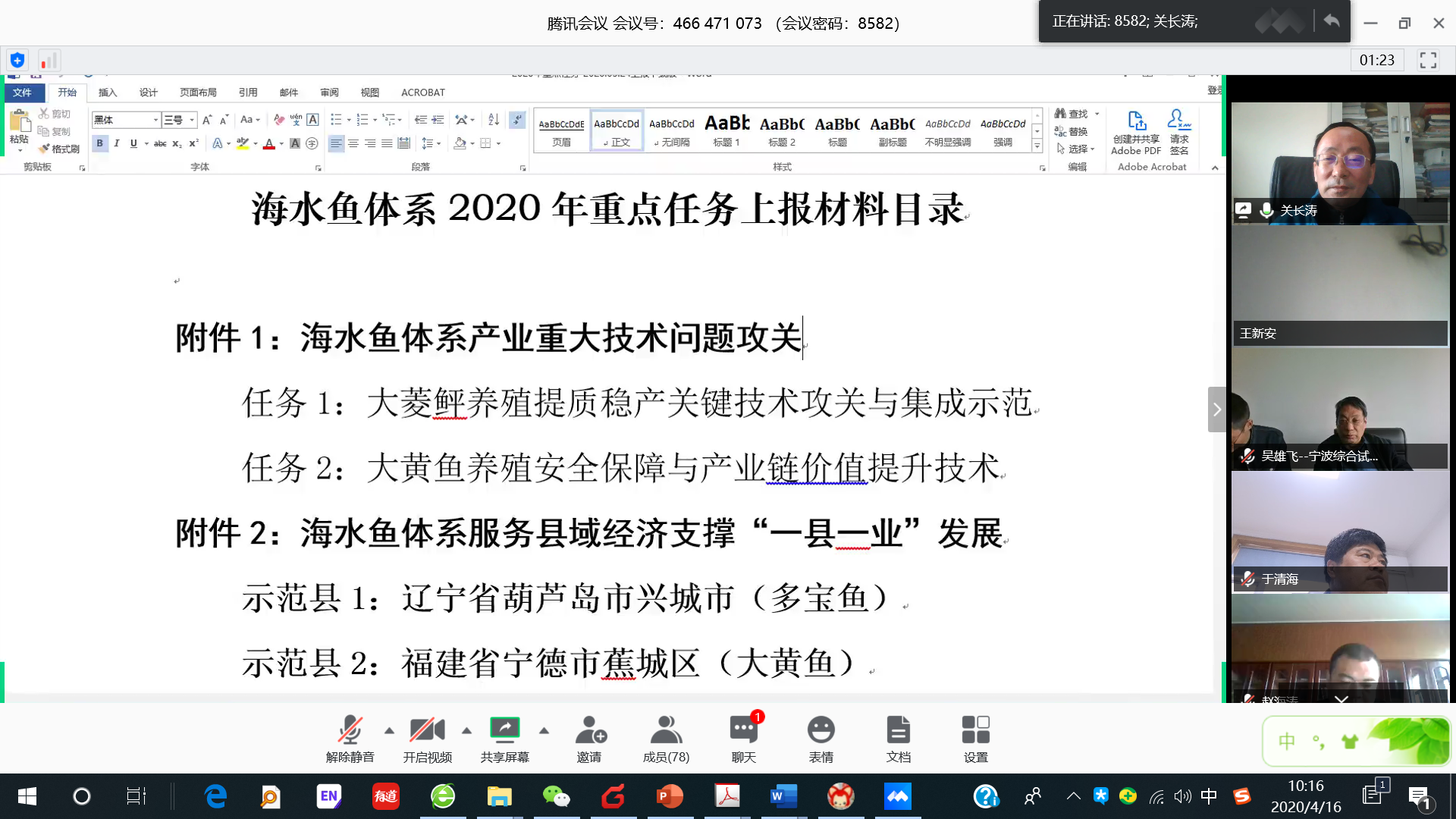 隨著全國疫情形勢逐漸好轉,各地復工復產有序進行,國家海水魚產業技術體系各項工作按下“快進鍵”。4月16日,國家海水魚體系首席辦公室組織召開了2020年重點工作推進視頻會,海水魚體系30位崗位科學家、19位綜合試驗站站長、部分團隊成員等70多人參加了此次會議,就科技助力漁業“穩產保供”和海水魚體系2020年重點任務推進等工作進行研討和部署。