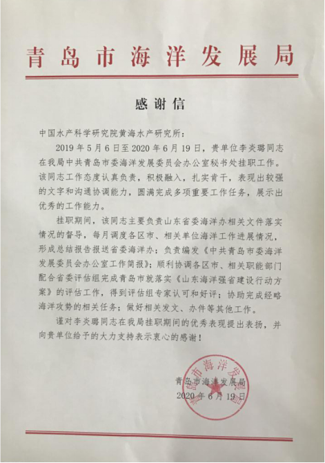 日前,中國水產科學研究院黃海水產研究所收到青島市海洋發展局發來的感謝信,對我所李炎璐同志在掛職期間的優秀表現提出表揚,并感謝我所給予的大力支持。