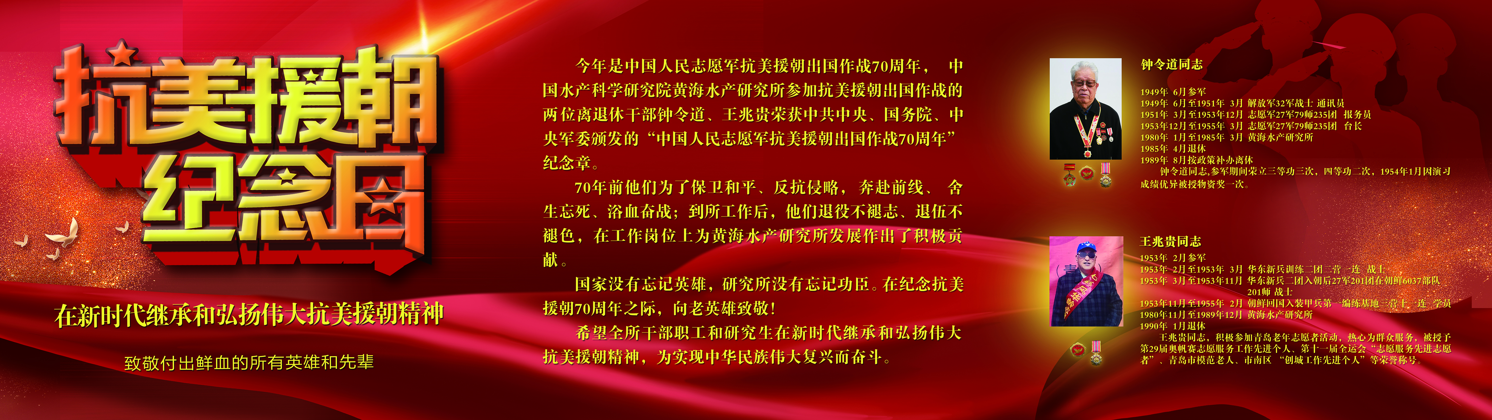今年是中國人民志愿軍抗美援朝出國作戰70周年,中國水產科學研究院黃海水產研究所參加抗美援朝出國作戰的兩位離退休干部鐘令道、王兆貴,榮獲中共中央、國務院、中央軍委頒發的“中國人民志愿軍抗美援朝出國作戰70周年”紀念章。