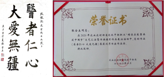 在2020年農(nóng)業(yè)農(nóng)村部離退休干部職工“增添正能量 共筑中國(guó)夢(mèng)”文藝匯演暨書畫攝影作品展演活動(dòng)中,中國(guó)水產(chǎn)科學(xué)研究院黃海水產(chǎn)研究所退休干部張金土同志的書法作品《醫(yī)者仁心 大愛無(wú)疆》榮獲優(yōu)秀書法作品獎(jiǎng)。