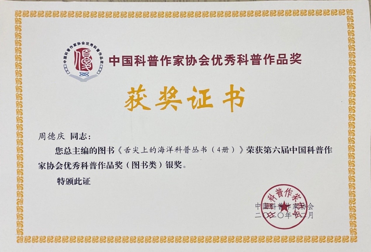 11月13日,中國科普作家協會公布了第六屆“中國科普作家協會優秀科普作品獎”獲獎作品名單,評選出科普圖書類金獎作品10種、銀獎作品19種。中國水產科學研究院黃海水產研究所周德慶研究員作為總主編編著的“舌尖上的海洋”科普叢書(四冊)榜上有名,獲得科普圖書類優秀科普作品銀獎。