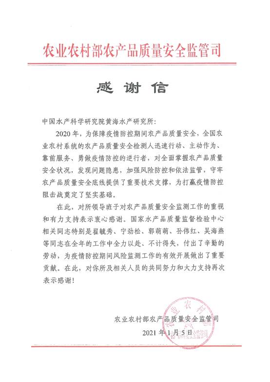 近日,農業農村部農產品質量安全監管司向中國水產科學研究院黃海水產研究所發來致謝信,對黃海水產研究所領導班子在疫情期間對農產品質量安全監測工作的重視和有力支持表示衷心感謝,并對國家水產品質量監督檢驗中心(以下簡稱中心)在2020年農產品質量安全監測工作中全力以赴、不計得失,付出的辛勤勞動和做出的貢獻提出表揚。