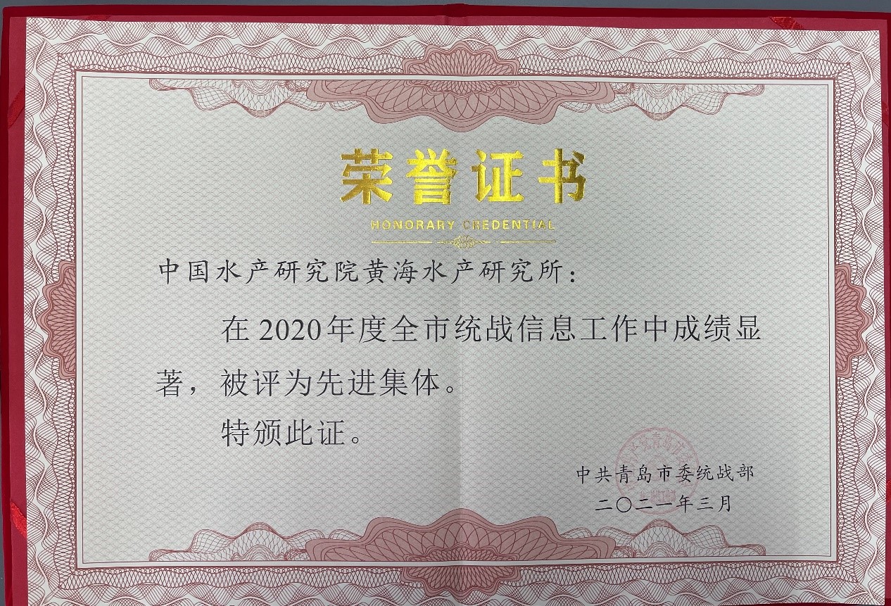 中國(guó)水產(chǎn)科學(xué)研究院黃海水產(chǎn)研究所連續(xù)四年榮獲“2020年度全市統(tǒng)戰(zhàn)信息工作先進(jìn)集體”榮譽(yù)稱號(hào),阮曉紅同志榮獲“2020年度全市統(tǒng)戰(zhàn)信息工作先進(jìn)個(gè)人”榮譽(yù)稱號(hào),李藝同志撰寫的《凝心聚力共謀發(fā)展 擔(dān)當(dāng)作為做實(shí)服務(wù)海洋——科研院所發(fā)揮黨外人士“專”“智”“聯(lián)”優(yōu)勢(shì)研究》獲2020年度全市統(tǒng)戰(zhàn)理論調(diào)研優(yōu)秀成果二等獎(jiǎng)。黃海水產(chǎn)研究所作為先進(jìn)集體代表之一在大會(huì)作《凝心聚力謀發(fā)展 攜手同心譜新篇》經(jīng)驗(yàn)交流發(fā)言。