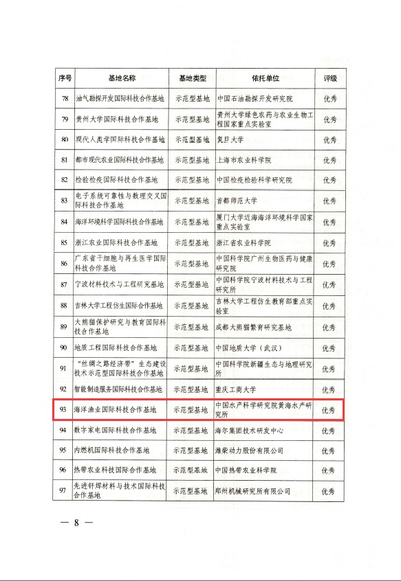 4月26日,科技部國際合作司公布了科技部國家國際科技合作基地2020年度綜合績效評估結果,依托中國水產科學研究院黃海水產研究所建設的科技部海洋漁業國際科技合作基地獲評“優秀”。