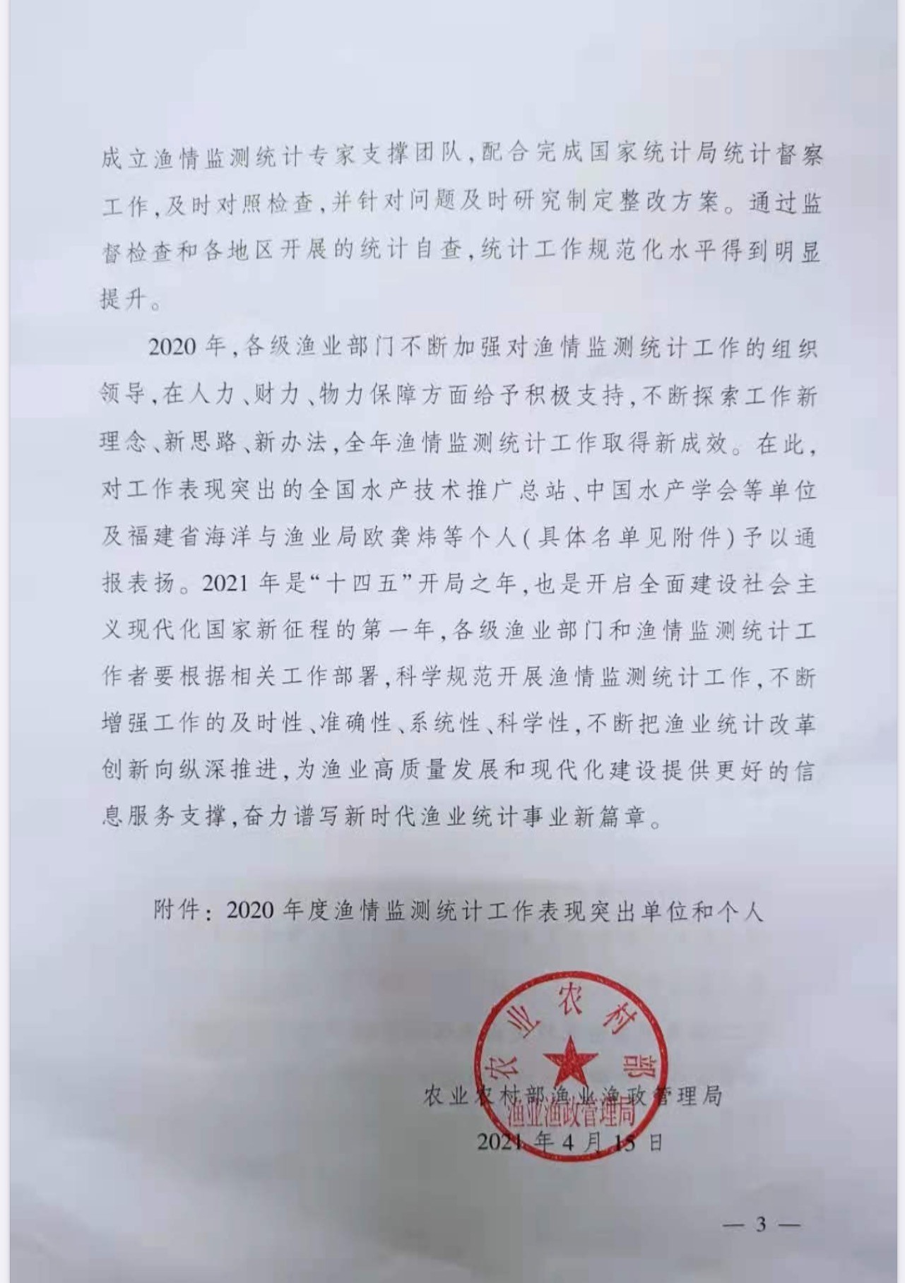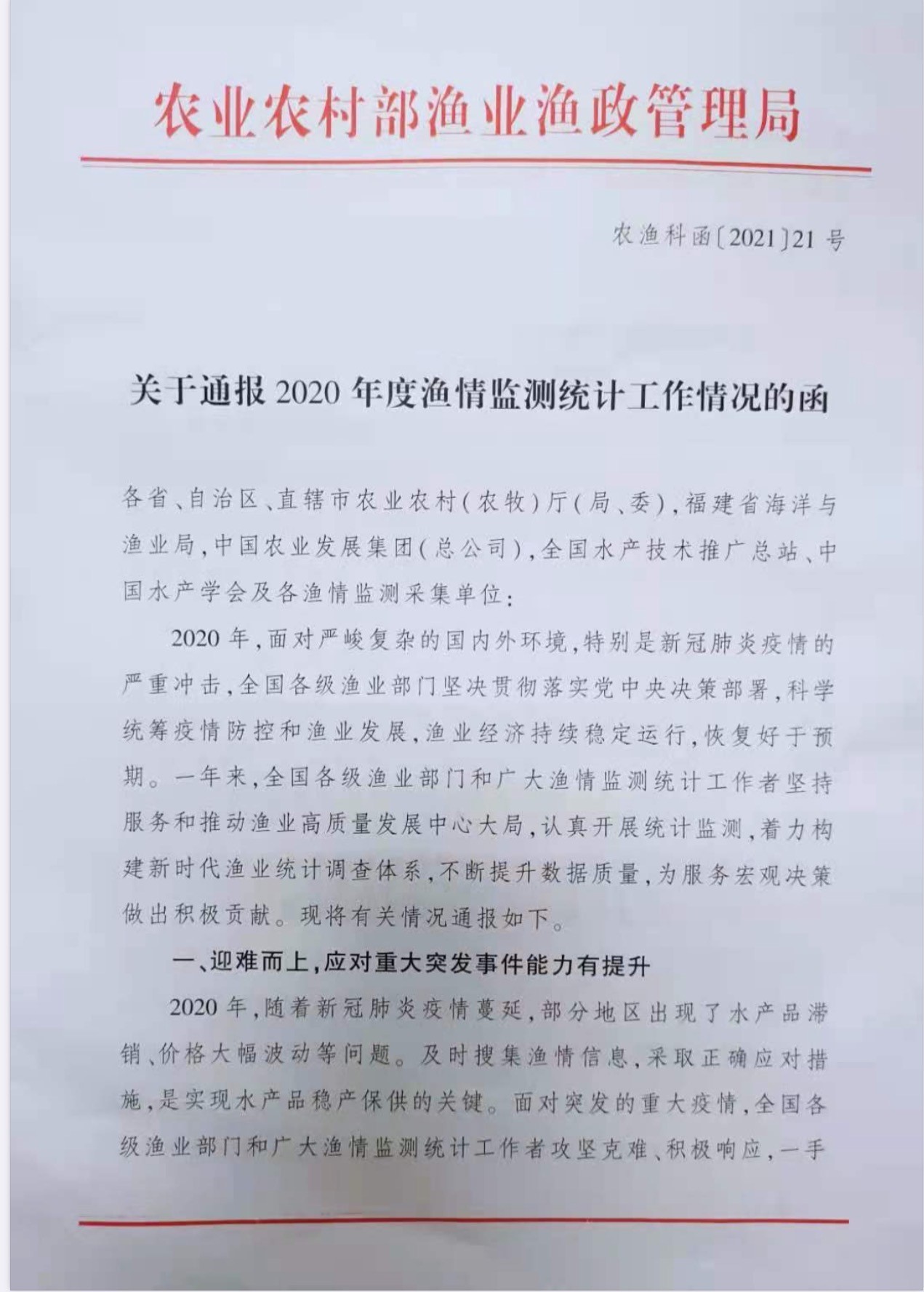近日,農(nóng)業(yè)農(nóng)村部漁業(yè)漁政管理局印發(fā)了《關(guān)于通報2020年度漁情監(jiān)測統(tǒng)計工作情況的函》(農(nóng)漁科函〔2021〕21號),通報了2020年度全國漁情監(jiān)測統(tǒng)計工作,并對工作表現(xiàn)突出的單位和個人進行了表彰。中國水產(chǎn)科學(xué)研究院黃海水產(chǎn)研究所李顯森研究員榮獲2020年度漁情監(jiān)測統(tǒng)計工作表現(xiàn)突出個人稱號。