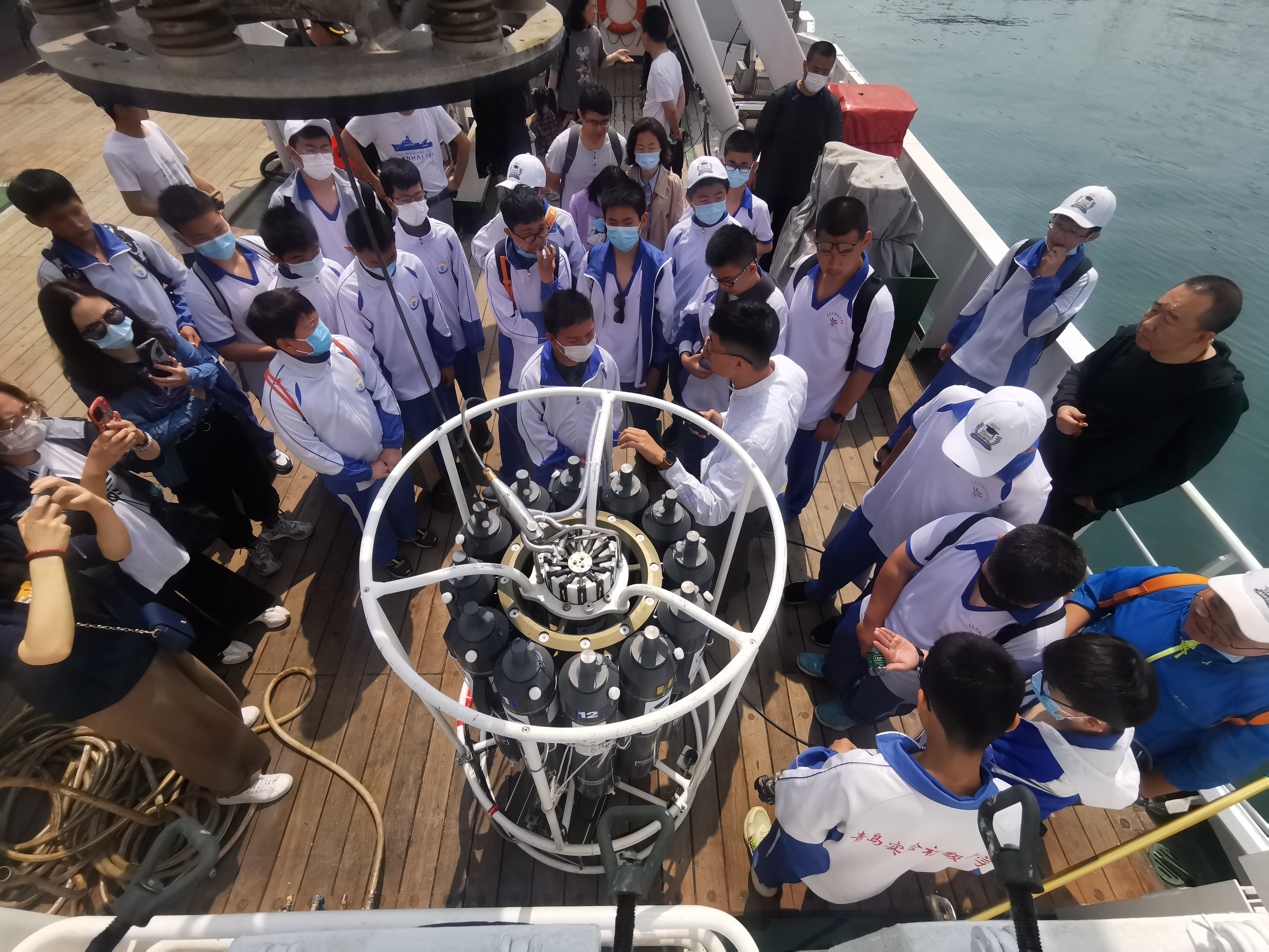 登船后,同學及家長們參觀了駕駛室、實驗室、科研調查設備、機艙等場所。船長、輪機長、大副、電機員和儀器員分別介紹了“藍海101”號調查船的建造歷程和科考功能,以及承擔的主要科考任務與取得的科研成果等相關情況,詳細回答了同學們提出的各類相關問題。
