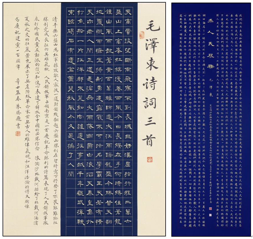 6月9日,由中央和國家機關工委主辦的“中央和國家機關慶祝中國共產黨成立100 周年書畫攝影展”活動在全國農業展覽館開展。經過層層選拔,中國水產科學研究院黃海水產研究所離退休干部李希平提交的書法作品《為人民服務》(下圖右)、水產生物技術與基因組研究室博士后朱騰飛的書畫作品《毛澤東詩詞三首》(下圖左)成功入展。