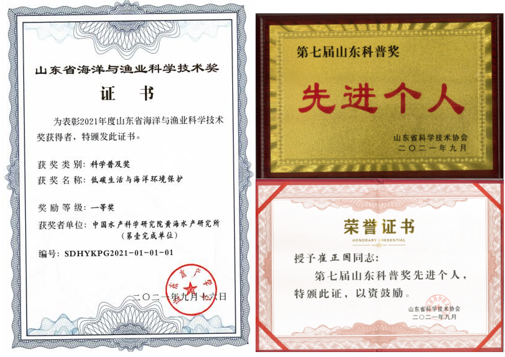 近日,由中國水產科學研究院黃海水產研究所漁業環境優化與循環水處理技術創新團隊完成的“低碳生活與海洋環境保護”成果獲2021年度山東省海洋與漁業科學技術獎一等獎(科普類),黃海水產研究所漁業環境與生物修復研究室副主任崔正國研究員獲評第七屆山東科普獎先進個人。