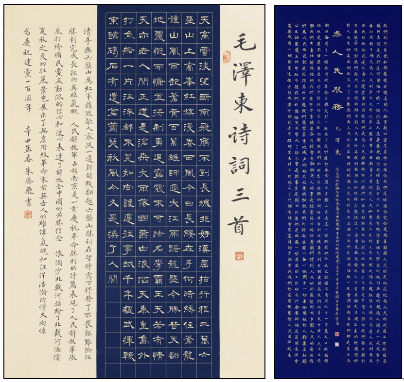 今年是中國共產(chǎn)黨成立100周年,農(nóng)業(yè)農(nóng)村部直屬機關(guān)工會組織舉辦了“永遠(yuǎn)跟黨走”農(nóng)業(yè)農(nóng)村部慶祝中國共產(chǎn)黨成立100周年職工書畫攝影展。中國水產(chǎn)科學(xué)研究院黃海水產(chǎn)研究所離退休干部李希平的作品《為人民服務(wù)》(下圖右)獲一等獎(書法類),水產(chǎn)生物技術(shù)與基因組研究室博士后朱騰飛的作品《毛澤東詩詞三首》(下圖左)獲二等獎(書法類)。