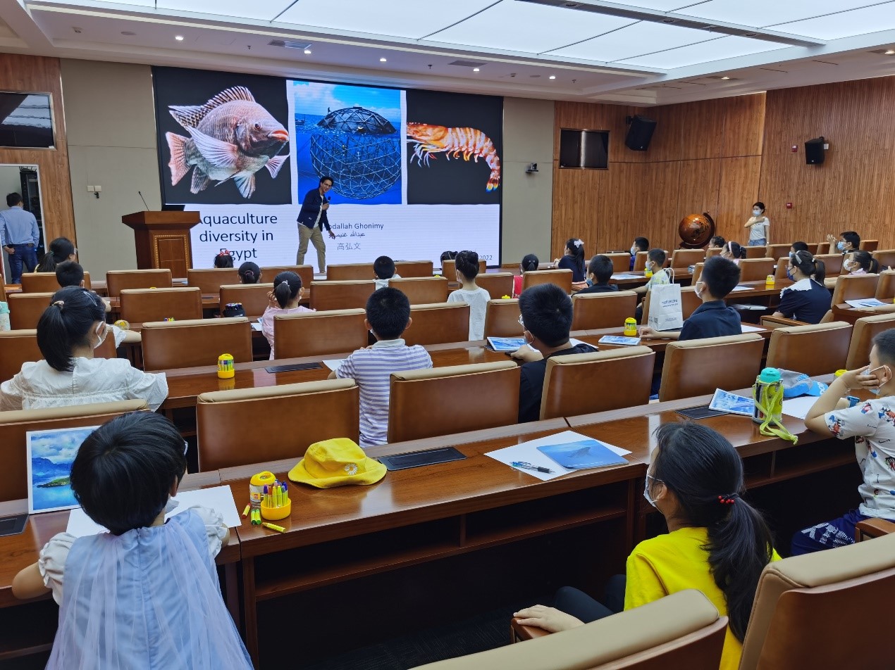 在科普講座環節,Abdallah Ghonimy博士和劉楠副研究員分別做了“Aquaculture Diversity in Egypt(埃及豐富多彩的漁業生物)”和“舌尖上的海洋——海洋食品的營養與安全”科普講座。講座圖文并茂、深入淺出地介紹了埃及豐富多彩的海洋漁業生物和海洋食品相關知識。孩子們一邊認真聽講,一邊用筆記錄所學。