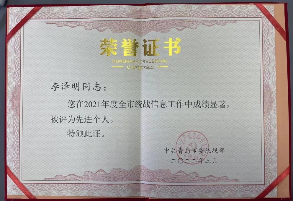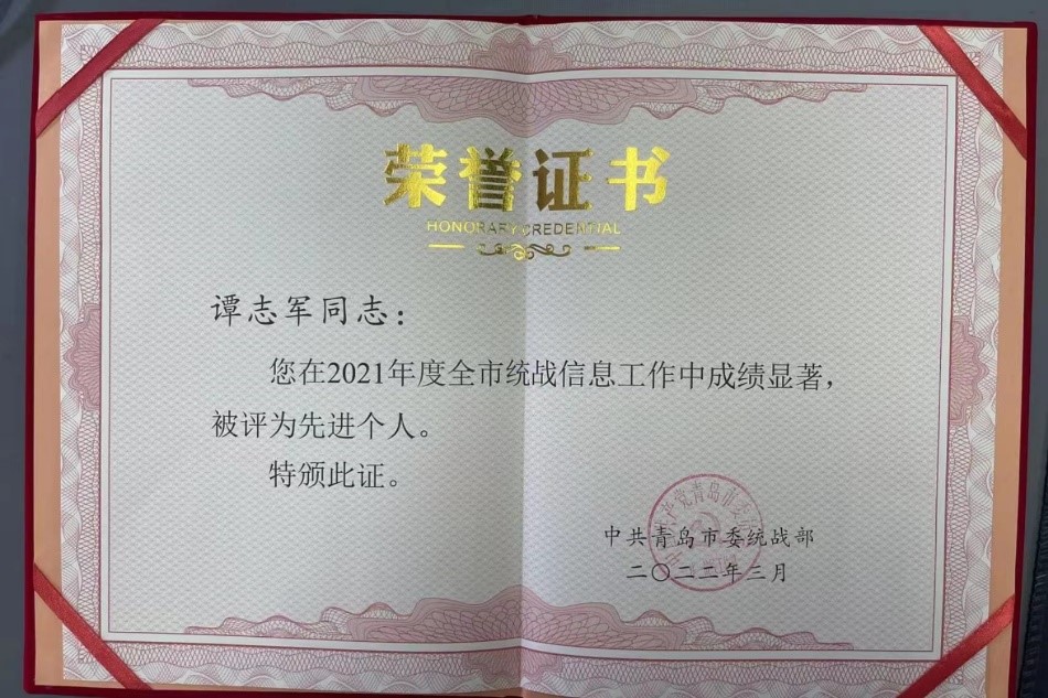 6月10日,青島市召開全市統戰部長會議,表彰了2021年度全市統戰各項工作先進集體、先進個人和優秀成果。中國水產科學研究院黃海水產研究所連續五年獲評青島市統戰信息工作先進單位,譚志軍、李澤明榮獲“2021年度全市統戰信息工作先進個人”,黃海水產研究所經驗交流文章《勠力同心謀發展 務實篤行譜新篇》,入選為大會書面交流材料。