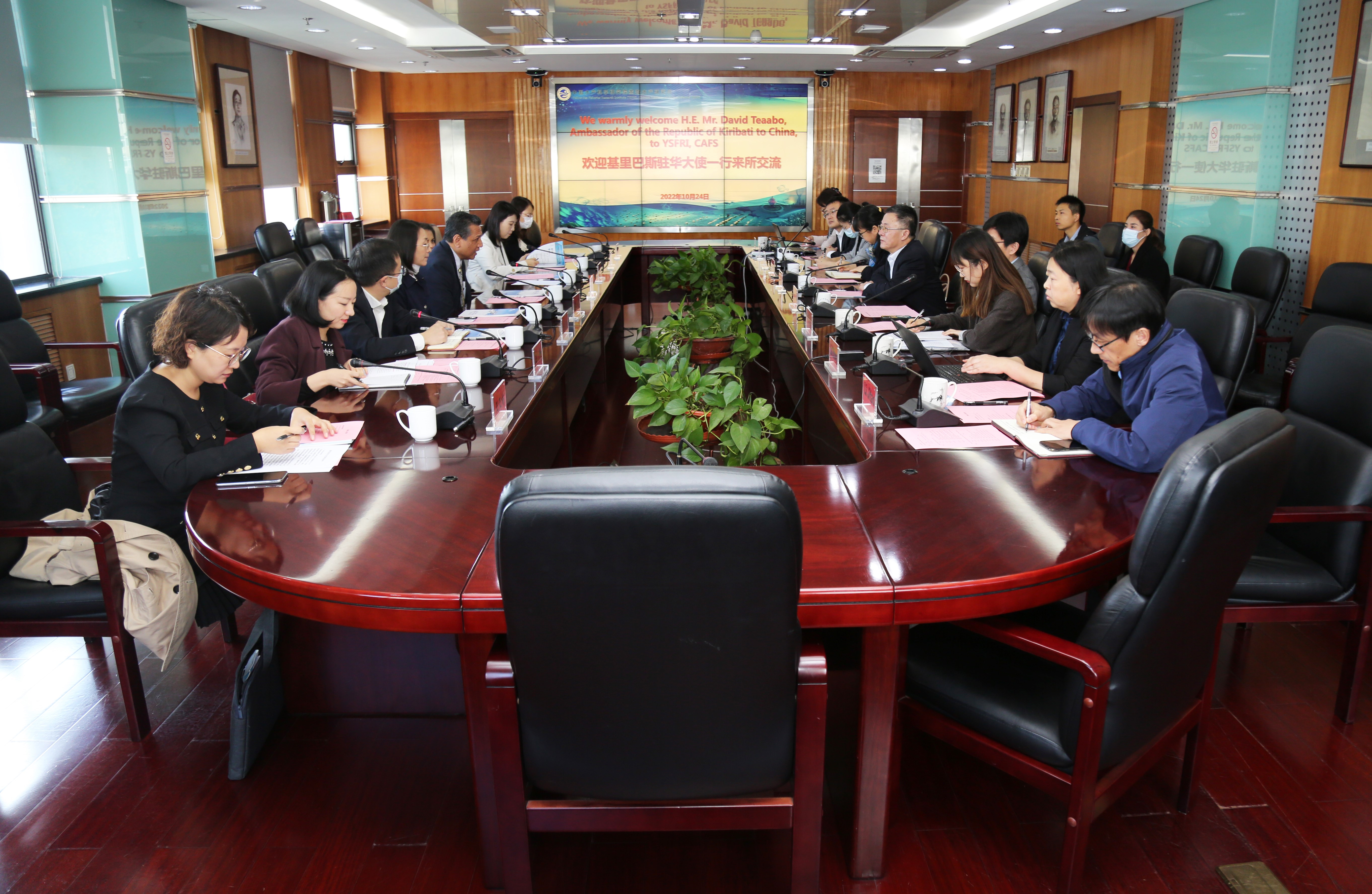 金顯仕所長對戴維·蒂阿博大使一行來所訪問交流表示歡迎,簡要介紹了黃海水產研究所的歷史沿革、機構設置、研究方向、科研成果等方面的基本情況,表示黃海水產研究所愿意發揮自身漁業科技和人才優勢,與基里巴斯推進漁業領域可持續發展合作,共同推動構建海洋命運共同體。科研處介紹了黃海水產研究所漁業國際合作的總體情況。