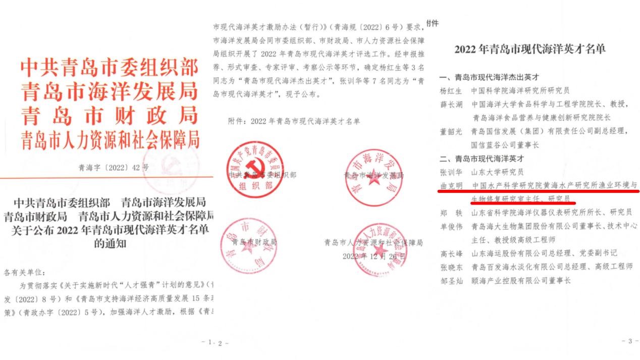日前,由青島市委組織部、市海洋發展局、市財政局和市人社局等單位組織開展的2022年“青島市現代海洋英才”評選工作,通過申報推薦、形式審查、專家評審和考察公示等環節,確定了10名同志獲“青島市現代海洋英才”榮譽稱號,中國水產科學研究院黃海水產研究所曲克明研究員獲此殊榮。