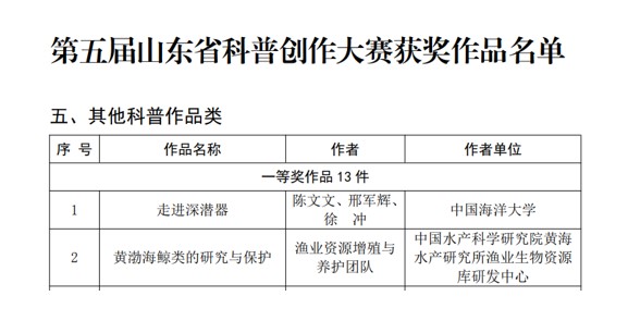近期,山東省科學技術協會、山東省教育廳、山東省科技廳、山東省工業和信息化廳、山東省文化和旅游廳公布了第五屆山東省科普創作大賽獲獎名單。由中國水產科學研究院黃海水產研究所提交的《黃渤海鯨類的研究與保護》繪本榮獲大賽其他科普作品類一等獎。
