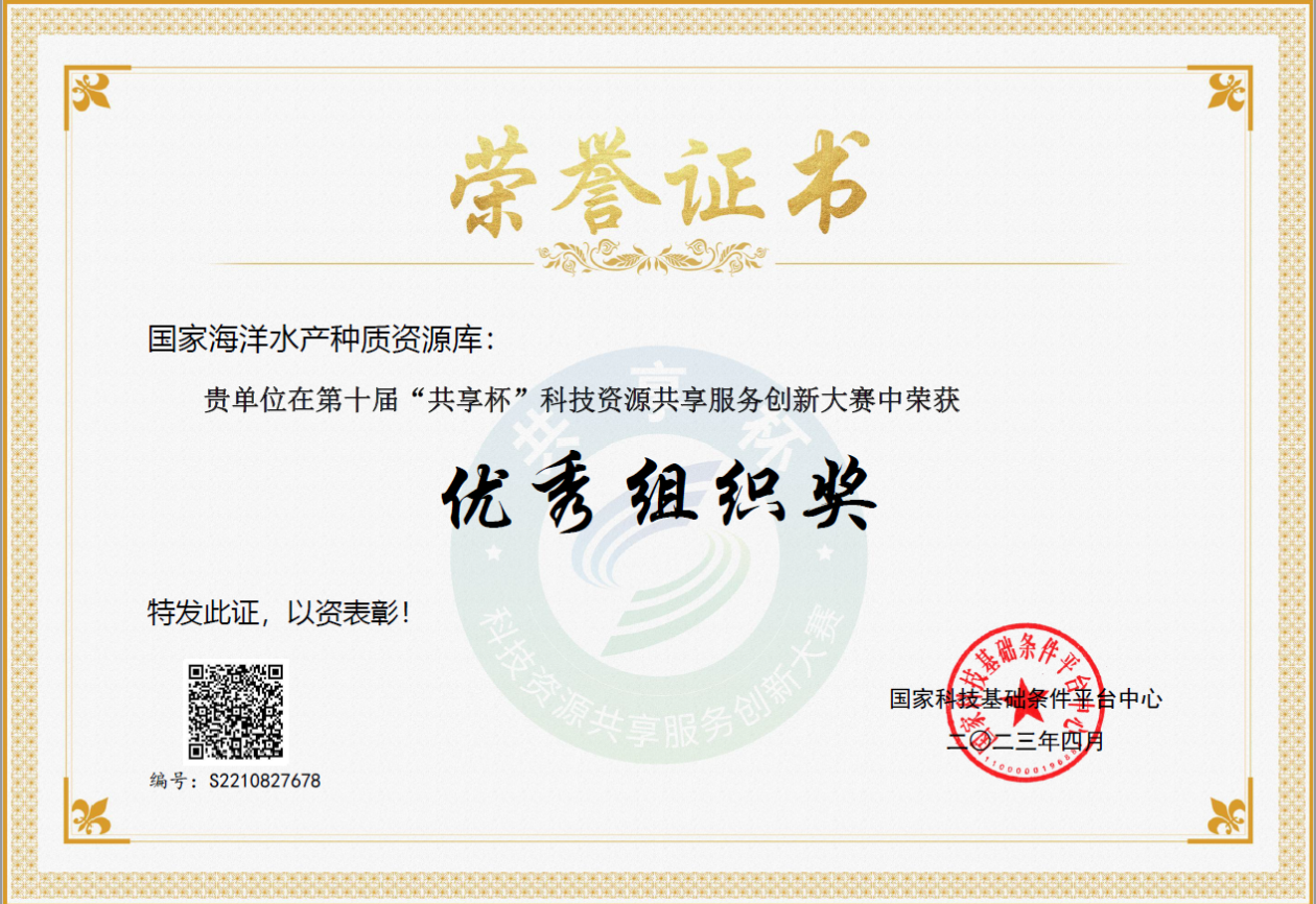 5月10日,科技部國家科技基礎條件平臺中心公布了第十屆“共享杯”科技資源共享服務創新大賽獲獎作品和表彰獎勵名單,中國水產科學研究院黃海水產研究所牽頭建設的國家海洋水產種質資源庫榮獲大賽優秀組織獎,劉志鴻、邵長偉、趙付文三位同志獲評突出貢獻獎。這也是國家海洋水產種質資源庫繼去年獲此獎項后,再次獲得大賽優秀組織獎稱號。