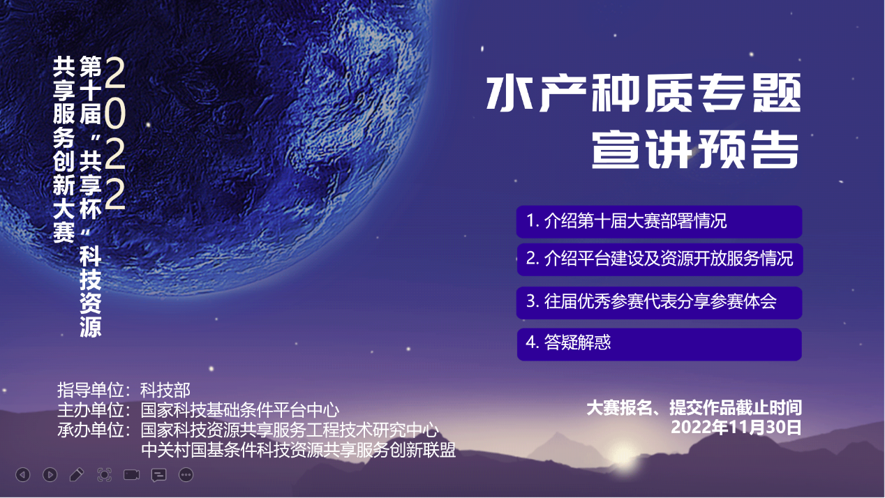 國家海洋水產種質資源庫作為科技資源共享服務平臺之一,積極組織參與“共享杯”大賽,緊密結合大賽共享資源特色和大學生創新創業特點,在第十屆大賽中發布水產領域相關賽題47個,包括創意設計類29個、應用軟件類12個、論文報告類6個;國家海洋水產種質資源庫聯合大賽組委會舉辦了大賽“水產種質”專題宣講會,來自全國涉海高校、科研院所的在校學生、科研人員以及往屆獲獎代表等140余人參加了宣講會。此外,國家海洋水產種質資源庫積極通過網站、微信公眾號、海報等媒介進行廣泛宣傳,有效組織動員了高校、科研院所提交參賽作品,全方位營造科技資源共享良好氛圍。