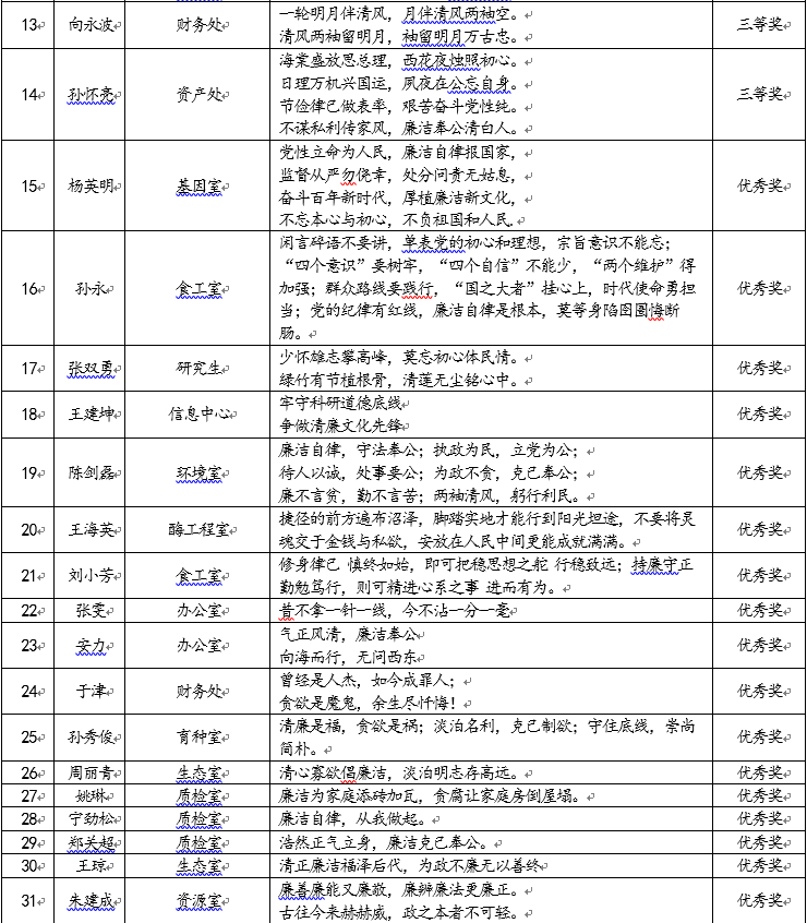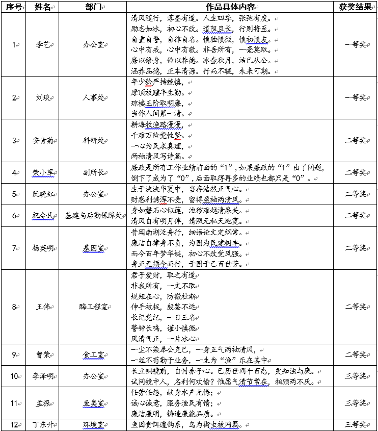 黃海水產研究所廉政詩詞格言警句優秀作品名單