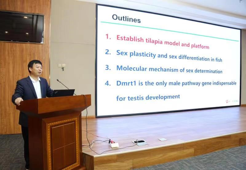聘任儀式后,王德壽教授做了題為“通過基因編輯解析羅非魚性別決定與分化的分子機制”的學術報告。從選定羅非魚作為性別決定和分化的研究模型引入,系統介紹了魚類性別的可塑性、性別決定的分子機制、dmrt1基因功能的研究成果等,最后以單個基因突變為例,提出性染色體進化和性別決定機制轉換的思考。報告為海水生物性別決定和分化以及基因編輯技術領域的專家學者提供了新思路,也為海水養殖生物基因編輯育種技術創新提供了借鑒和參考。