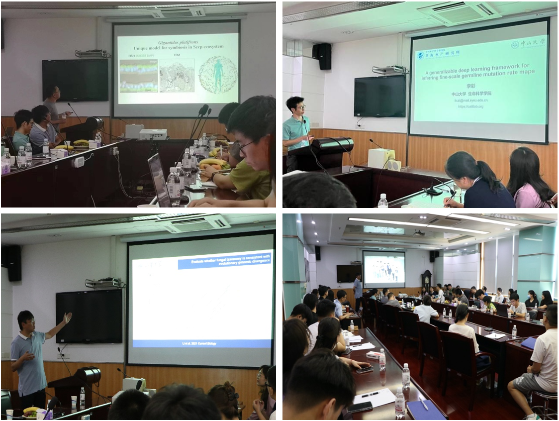 陳凱教授作了題為“細胞組學(xué)方法開發(fā)及應(yīng)用”的學(xué)術(shù)報告,系統(tǒng)介紹了單細胞ATAC-Seq 技術(shù)的開發(fā)工作以及結(jié)合單細胞測序和發(fā)育生物學(xué)手段揭示多巴胺神經(jīng)元終末分化保守的調(diào)控策略。李彩教授作了題為“A generalizable deep learning framework for inferring fine-scale germline mutation rate maps”的學(xué)術(shù)報告,詳細闡述了基于深度學(xué)習(xí)預(yù)測突變率的方法 — MuRaL (Mutation Rate Learner)。李遠寧教授作了題為“重建后鞭毛生物生命之樹”的學(xué)術(shù)報告,系統(tǒng)闡述了動物最早的進化分支和真菌進化歷程。三位教授的報告生動精彩,扎實的遺傳學(xué)和計算生物學(xué)功底更是讓人印象深刻,參加的師生對三位教授的報告反響熱烈,三位教授和與會師生們就感興趣的問題進行了熱烈的交流與深入的討論。