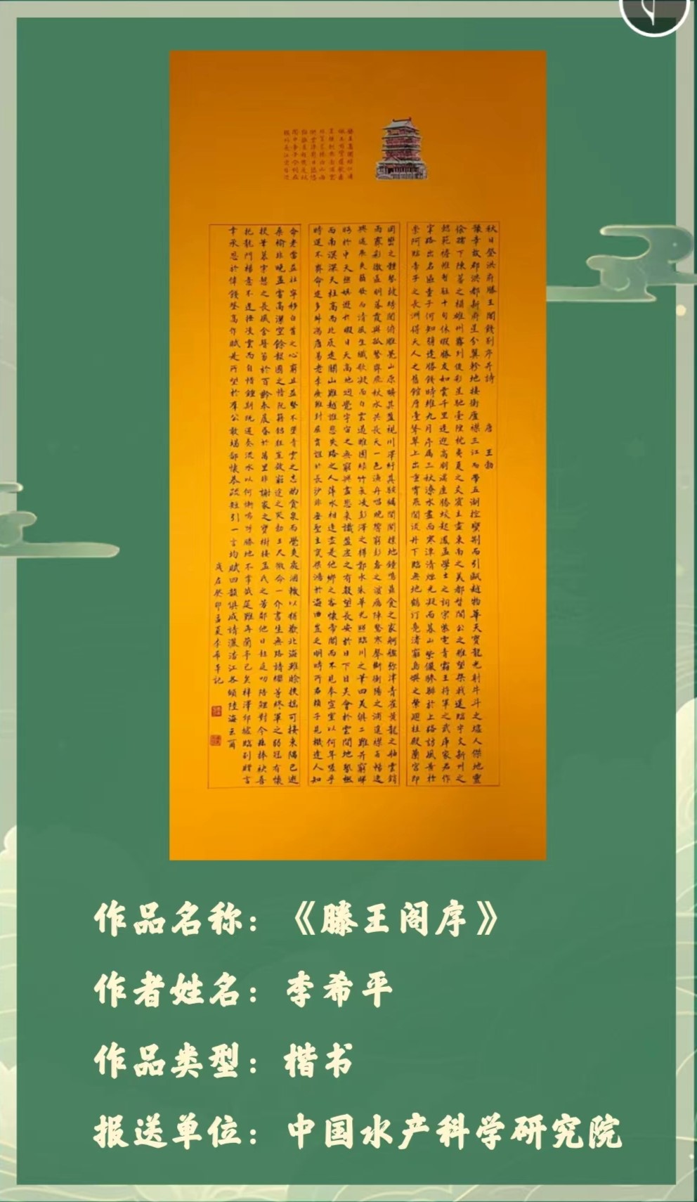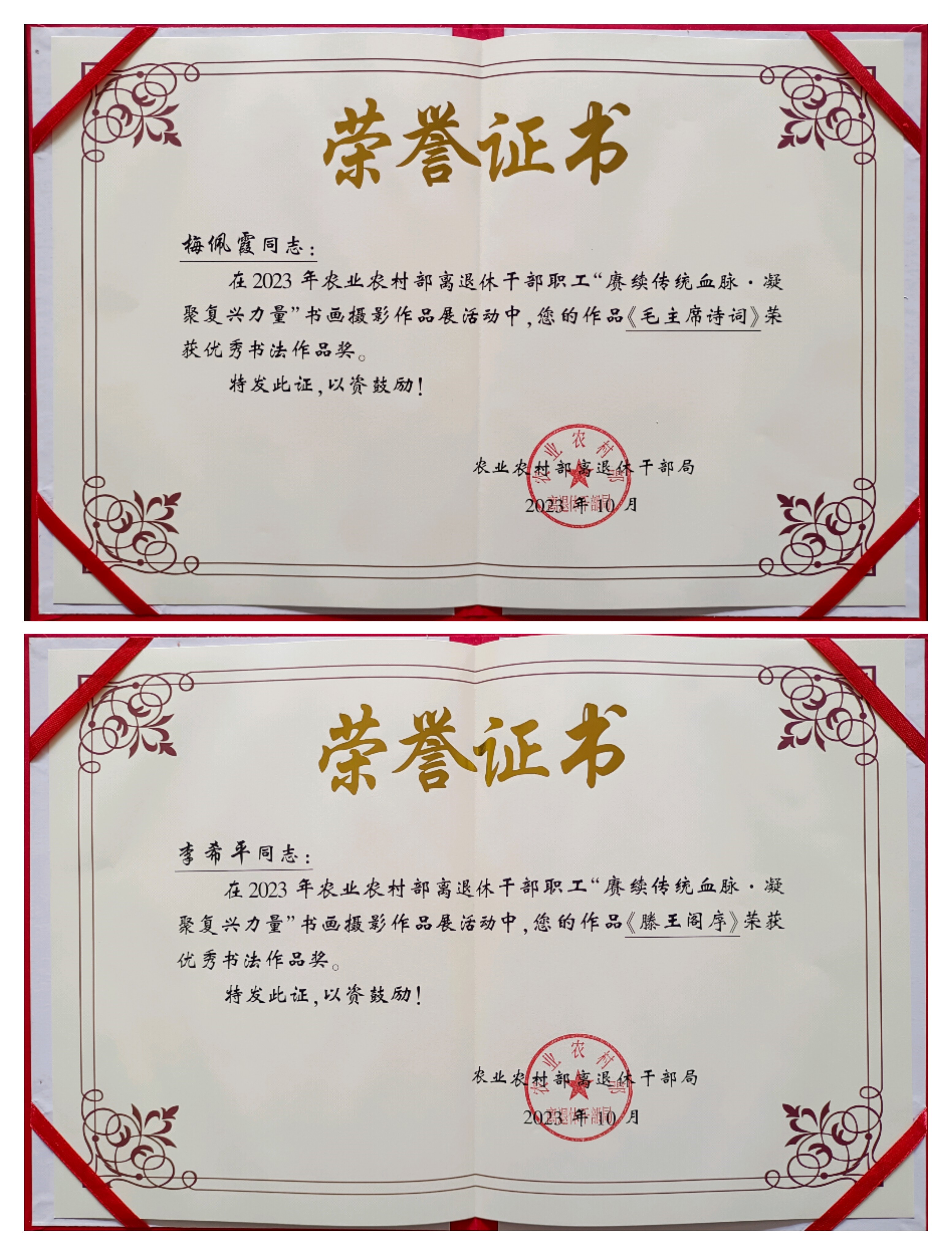 日前,農業農村部離退休干部局組織舉辦了部系統離退休干部職工“賡續傳統血脈·凝聚復興力量”文藝匯演和書畫攝影作品展,引導老同志講好中國故事,傳播中國好聲音,繼續為黨和國家事業增添正能量。中國水產科學研究院黃海水產研究所積極響應,退休干部梅佩霞的行草《毛主席詩詞》和李希平的楷書《滕王閣序》等2幅書畫作品在31個單位334幅書畫攝影作品中獲通報表揚,并獲得榮譽證書。