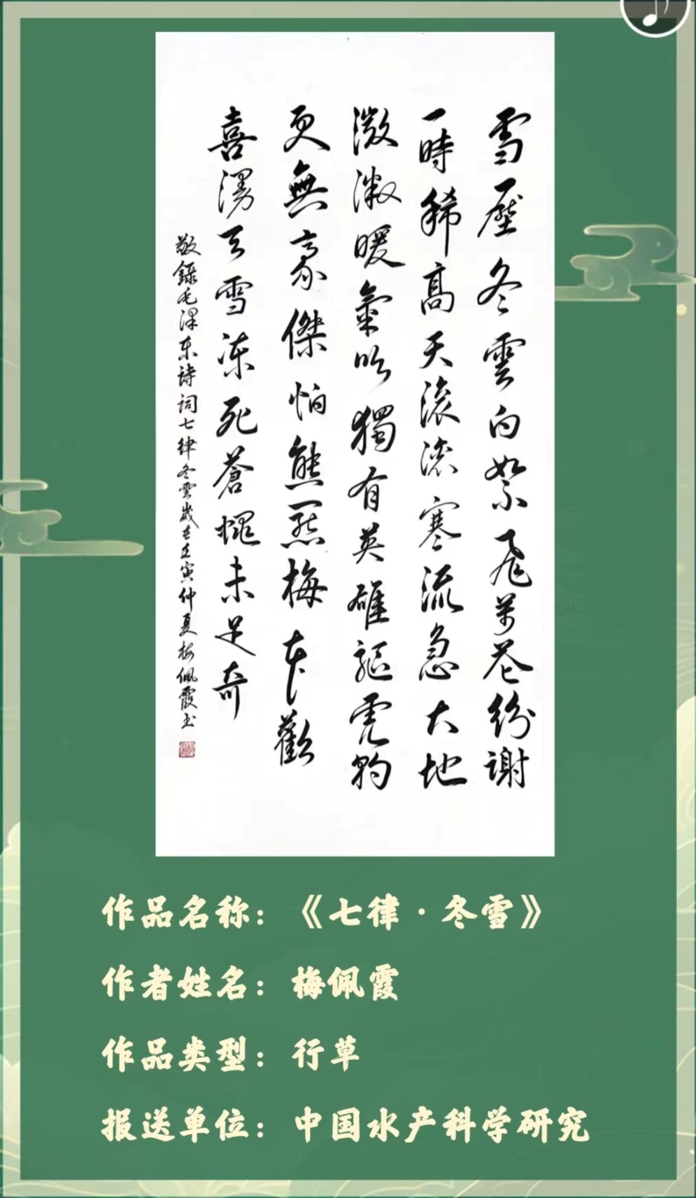 此次提交的作品通過以筆抒情、以墨釋懷,充分展示了黃海水產研究所離退休職工厚重的文化底蘊和藝術積淀,體現了新時代老同志良好的精神風貌,呈現了我所和諧向上的創新文化氛圍。