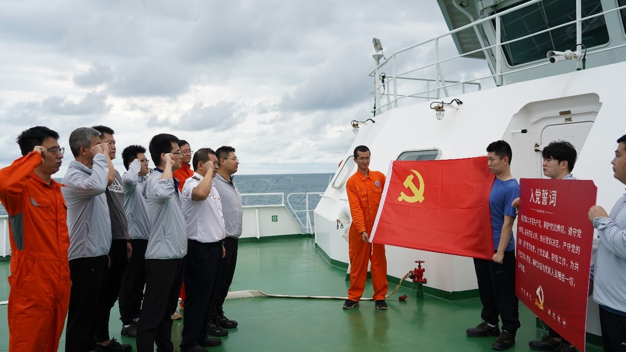 3日上午10時50分,“藍海101”號調查船穿越赤道,海上工作組全體成員齊唱國歌,共同注視五星紅旗冉冉升至赤道上空。隨后,中西印度洋公海漁業資源綜合科學調查臨時黨支部全體黨員面對黨旗,莊重地重溫入黨誓詞,表達對黨的忠誠和對祖國科研事業的無限熱愛。儀式現場氣氛莊重肅穆,愛國愛黨的拳拳之情久久縈繞在全體黨員心頭。