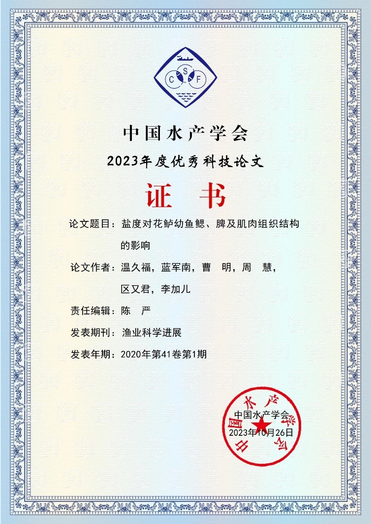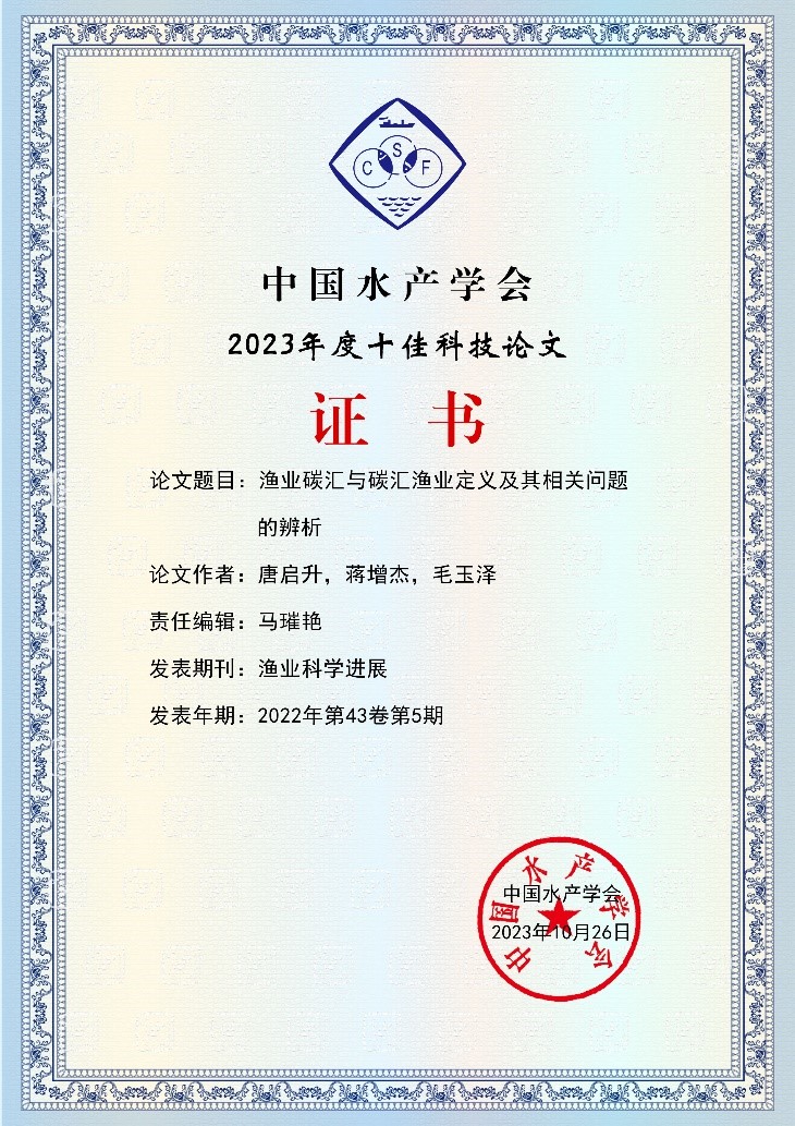 11月28日,中國水產學會成立60周年暨2023范蠡學術大會在重慶召開。大會公布了2023年度中國水產學會科技論文評價結果?!稘O業科學進展》2022年第43卷第5期的綜述論文《漁業碳匯與碳匯漁業定義及其相關問題的辨析》榮獲中國水產學會2023年度十佳科技論文,2020年第41卷第1期的研究論文《鹽度對花鱸幼魚鰓、脾及肌肉組織結構的影響》榮獲中國水產學會2023年度優秀科技論文。