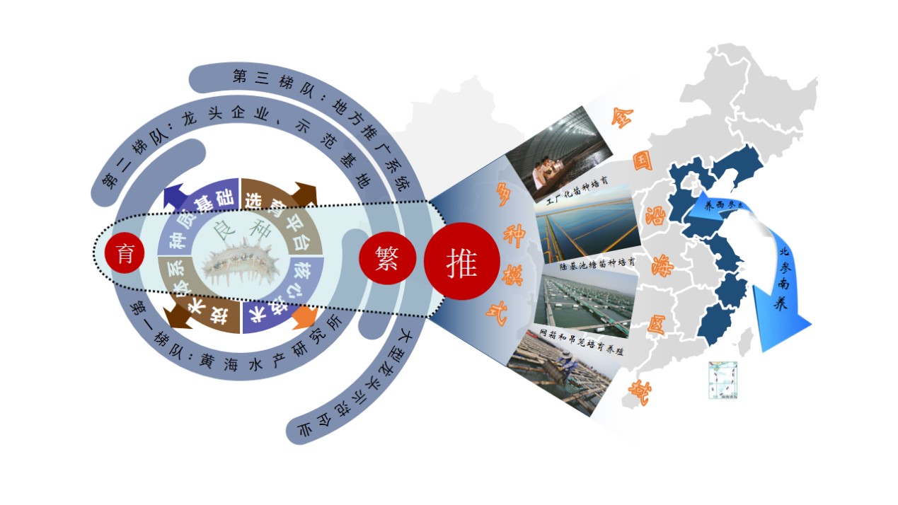 “刺參‘參優(yōu)1號’育繁推技術(shù)體系建設(shè)及產(chǎn)業(yè)化示范”項(xiàng)目以海參養(yǎng)殖產(chǎn)業(yè)技術(shù)需求為導(dǎo)向,融合科研院所、推廣站、龍頭企業(yè),搭建起“研、推、用”三位一體的種業(yè)平臺,形成產(chǎn)學(xué)研深度融合的科技創(chuàng)新機(jī)制,推動創(chuàng)新成果在青島本埠的落地實(shí)施。黃海水產(chǎn)研究所聯(lián)合青島瑞滋集團(tuán)有限公司,采取聯(lián)合申報(bào)科技項(xiàng)目、企業(yè)委托研發(fā)、專利技術(shù)轉(zhuǎn)讓、企業(yè)創(chuàng)新平臺建設(shè)等多種模式,形成“責(zé)、權(quán)、利”清晰、科研與企業(yè)上下游聯(lián)動的合作局面,培育出生長速度快、抗病力強(qiáng)的“參優(yōu)1號”國審水產(chǎn)新品種,苗種市場占有率超30%,建成全國首個國家級刺參良種場,實(shí)現(xiàn)了“技術(shù)研發(fā)、示范應(yīng)用、轉(zhuǎn)化推廣”的目標(biāo)。