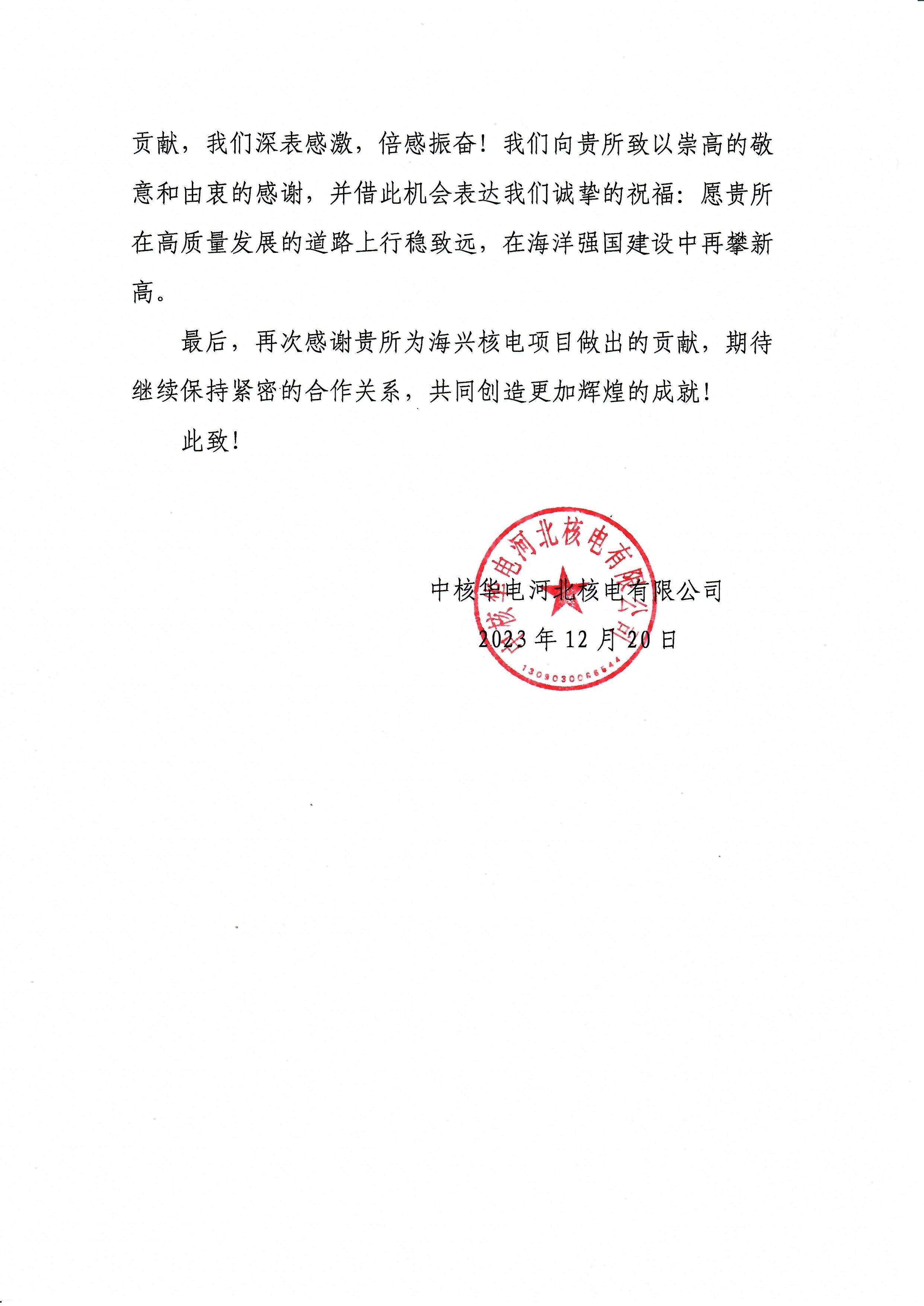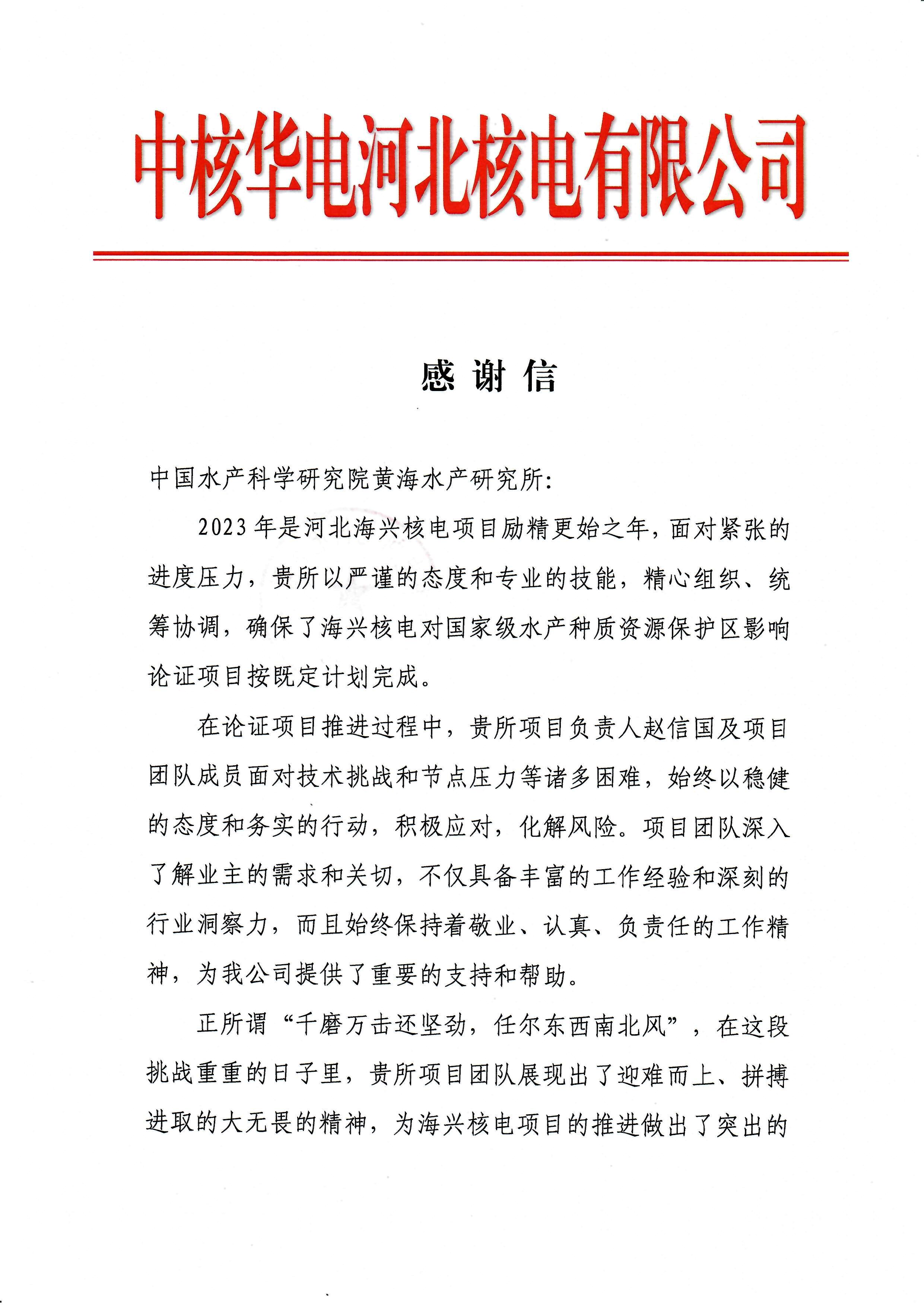 針對后期專題論證報告審查流程和國家級水產種質資源保護區面積范圍調整遲滯論證工作進度等實際困難,團隊經過多次主動與建設單位和主管部門溝通協調,確定了專題論證報告先行編制和審查,待保護區面積范圍調整完成后再行審批的工作思路,極大壓縮了專題論證工作所需時間。目前,專題論證報告已經主管部門組織專家初審通過,確保了專題論證工作按既定計劃高質量完成和河北海興核電項目的順利推進。