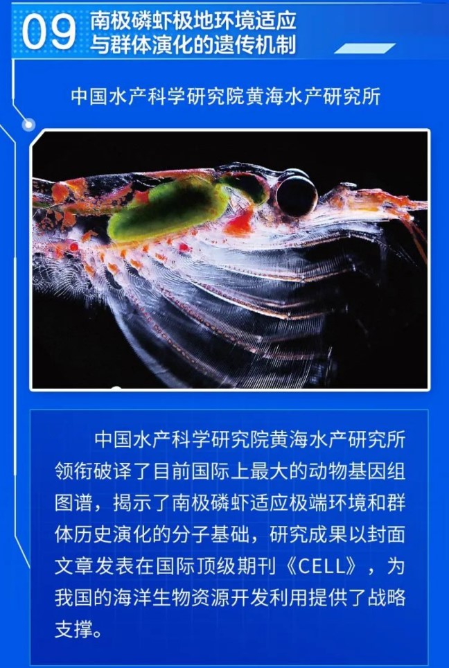 黃海水產研究所邵長偉領銜的國際團隊利用我國科學家自主研發的基因組組裝算法,突破了超大且高重復基因組組裝技術瓶頸,繪制了迄今為止最大的動物基因組圖譜(基因組大小為48Gb,約是人類基因組的16倍,重復序列高達92.45%);首次揭示了南極磷蝦適應極晝極夜生物節律的分子機制;證實了環南極不同群體間的遺傳連通性,發現了環境對種群結構的潛在影響,解析了南極磷蝦種群擴張的演變規律。上述科學發現為海洋生物極端環境適應機制及群體演化研究提供了新的理論參考,為極地漁業資源的管理提供了理論依據。