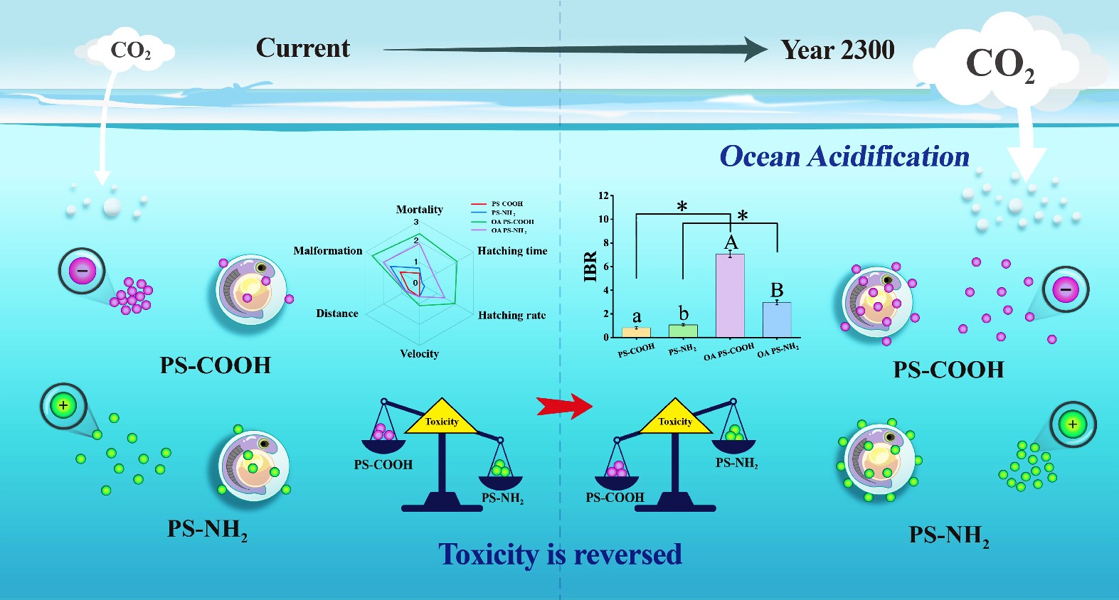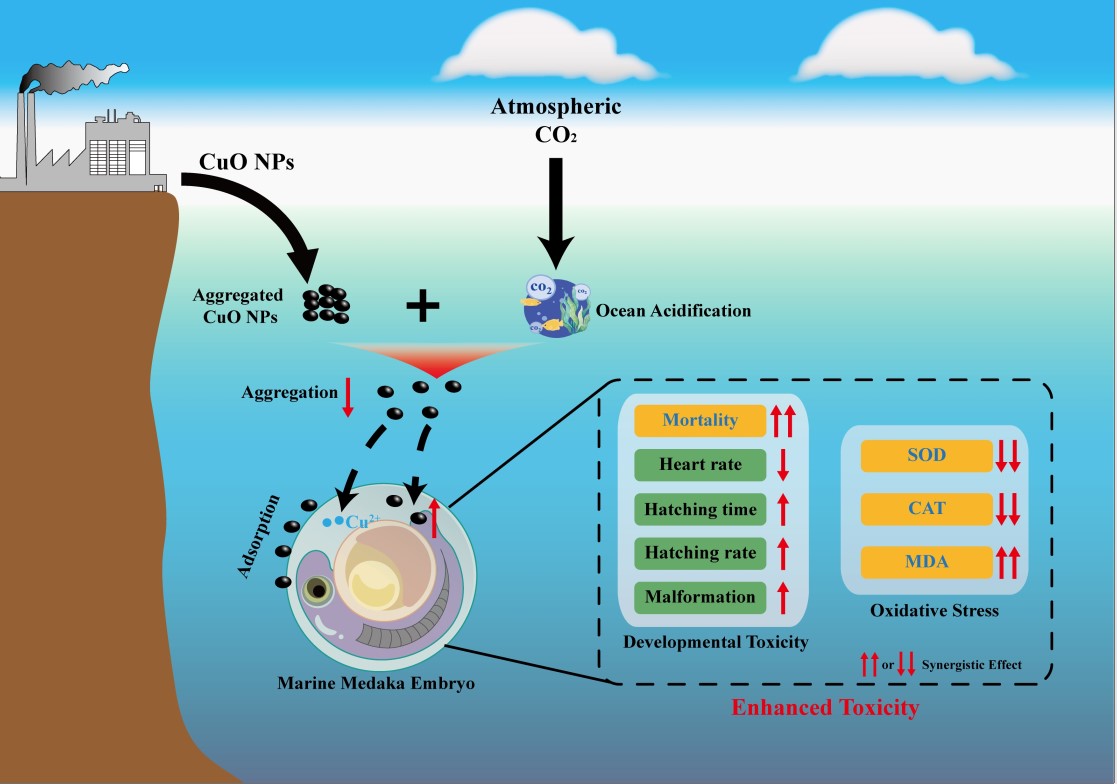 新污染物和氣候變化是全球關注的重大環境問題。黃海水產研究所黃渤海漁業生態環境評價與生物修復創新團隊以典型新污染物納塑料和金屬納米顆粒為研究材料,以模式生物小球藻和海水青鳉為研究對象,開展了海洋酸化耦合納米CuO顆粒/聚苯乙烯納塑料、UV-B輻射耦合納米TiO2顆粒的生物毒性效應研究,系統闡明了氣候變化耦合典型新污染物的海洋環境效應。